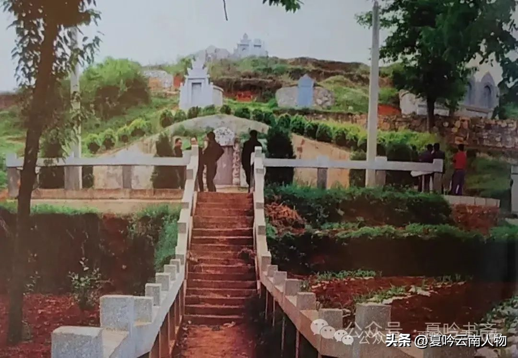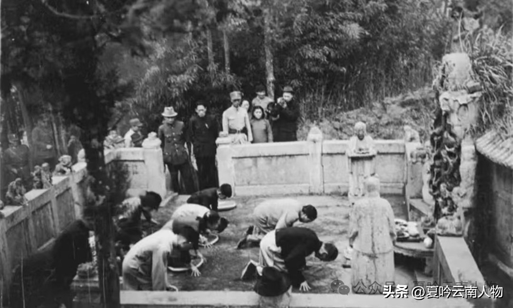 阿书牟1923年过世后,先葬于炎山龙母墓旁,1943年和龙母墓一起迁葬到现昭阳区簸箕湾龙家祠堂后小松山,图为1943年清明节龙云带顾映秋和李培莲子女前往扫墓,现阿书牟墓完好。