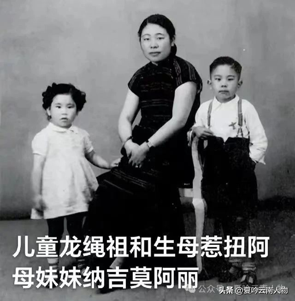 图中照片为阿业菊和儿子龙绳祖、女儿达史阿力,从照片看龙绳祖照相时3、4岁左右,达史阿力在1岁到2岁之间,照相时间应该在1914年左右。据多人回忆录中有提到惹扭阿母曾经随龙云在军中生活。