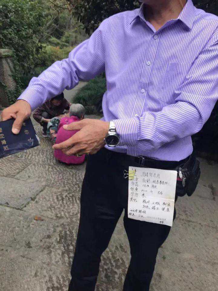 有位紫色条纹衬衣大叔腰间别着征婚信息,像是移动的广告。
