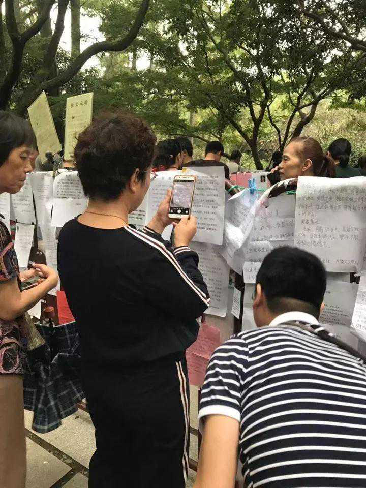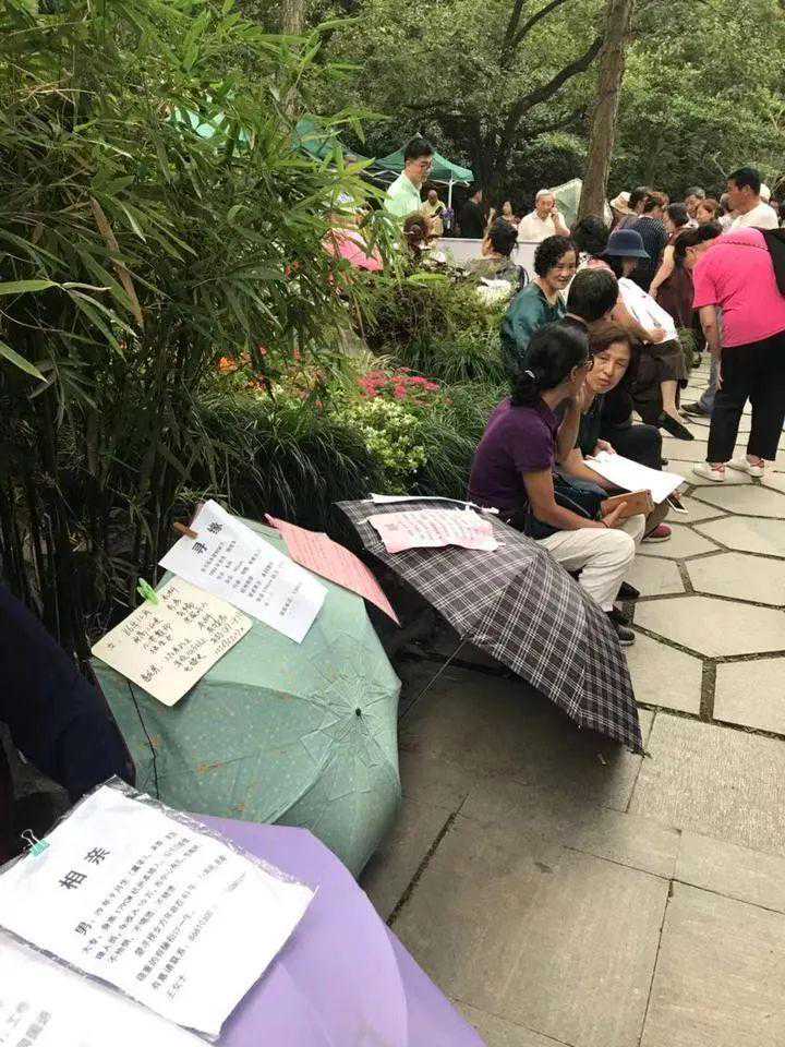 杭州的陈先生夫妇,穿着朴素。早早占据了一棵树下的c位,在伞上贴了张纸,“女孩征婚”四个字特别醒目。