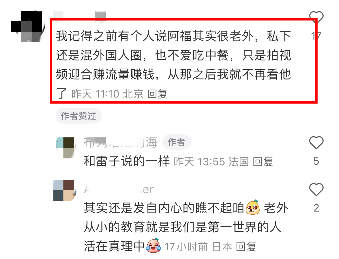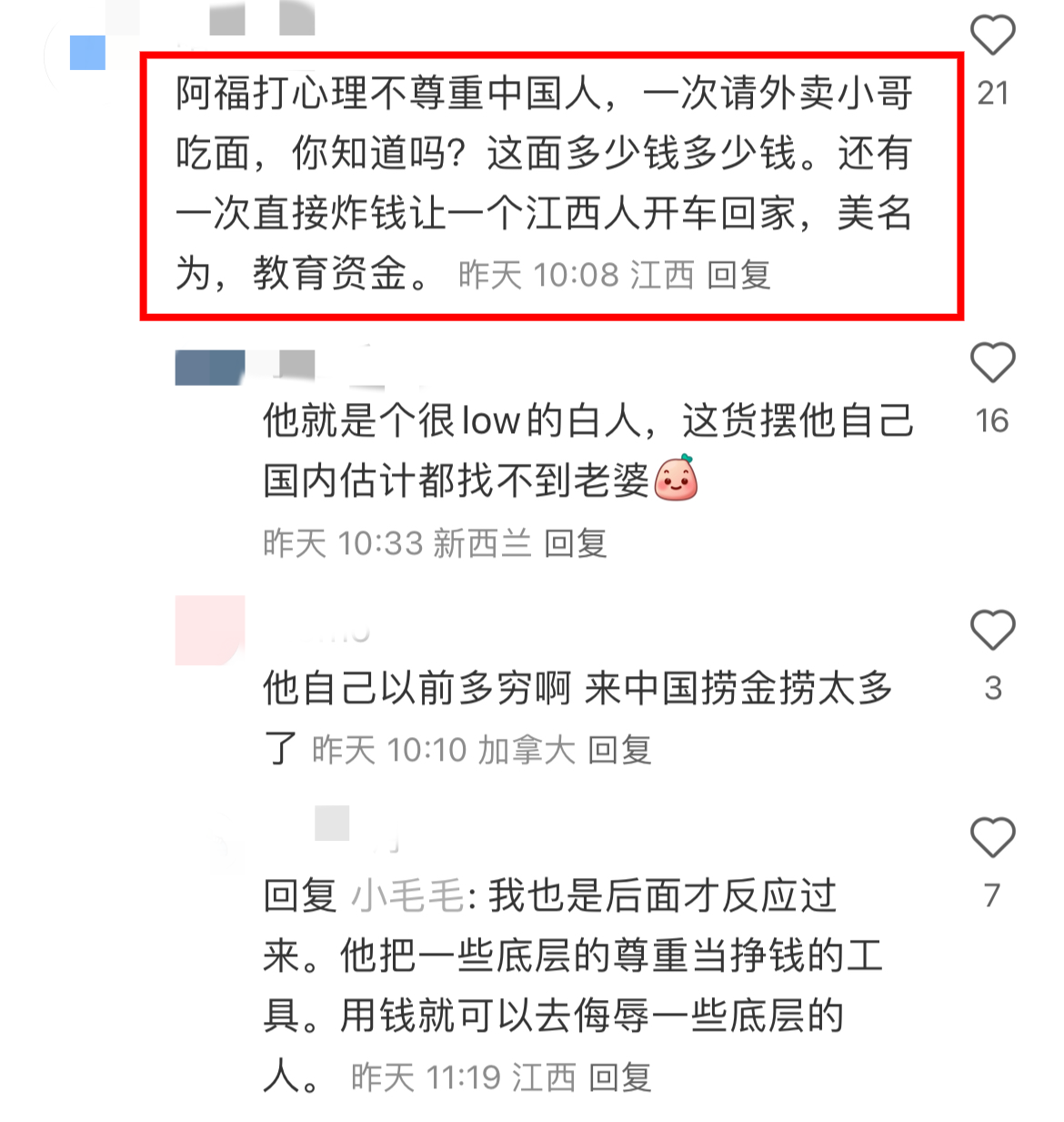 阿福的口碑和在网络上的风评急转直下,不断有网友开始爆料,其中有不少网友称阿福早在之前,请外卖小哥吃饭就表现出了非常不尊敬甚至发问“你们知道这面多少钱么”?而且此行为不止一次,还有一次直接炸钱让一个江西人回家,并称为“教育资金”。