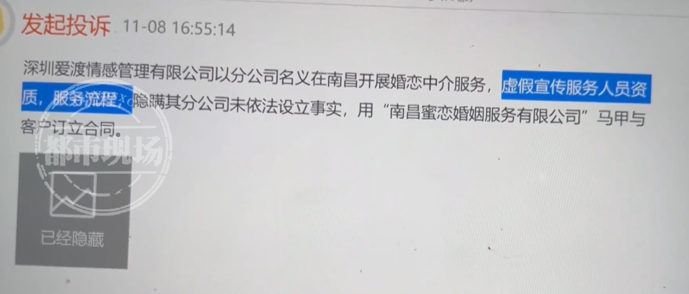 恋爱结婚讲究缘分,很多人都觉得应该顺其自然,然而在当下这个快节奏的生活时代,也有人为脱单问题感到焦虑。为了解决婚恋问题,一些人选择向高端婚恋机构寻求帮助,希望通过它们的“牵线”,找到另一半。然而,一些鱼龙混杂的婚介机构,却让不少人栽了跟头。消费者想找真爱,他们却把消费者当“韭菜”!今年的3·15前夕,江西都市频道24小时新闻热线0791—88316800就接到了多位消费者对一家名叫“爱渡”的婚恋机构的投诉。