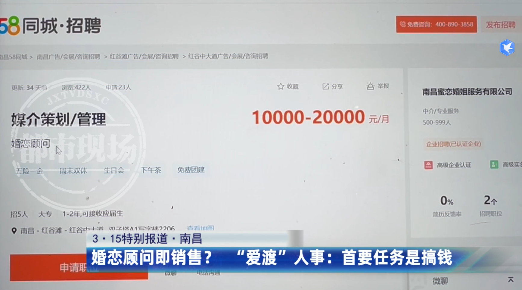 为了一探究竟,记者应聘了“爱渡”南昌线下直营店的婚恋顾问,很快便接到了面试邀约。2月13日,记者来到了南昌市红谷滩区绿地双子塔A1-2206室。负责招聘的人事工作人员介绍,婚恋顾问实际上就是销售红娘,每天的工作是打电话邀约客户上门见面,然后想尽办法让客户购买相亲套餐,目标十分明确——要搞钱。