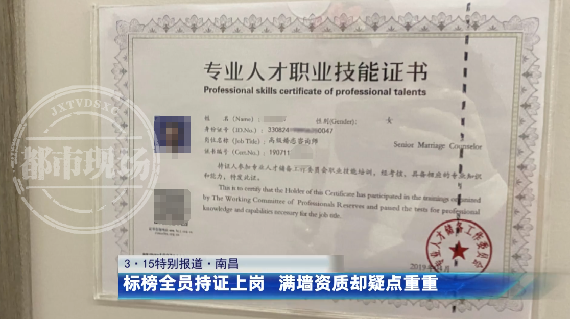 仅仅几天之后,十几张证书便被贴在过道的墙面显眼位置。每位客户到店,“红娘们”都会特意介绍,他们是国家认证的情感老师。不过,记者仔细查看证件上的名字,发现只有店长和服务部经理两人是门店的工作人员。而且这些证书的真伪也存在问题,证书上写着专业人才储备工作委员会颁发的“专业人才职业技能证书”,记者通过查询,仅找到一个叫“全国专业人才储备工作委员会”的组织,而2021年5月19日,该组织被北京市民政部门列为非法社会组织。