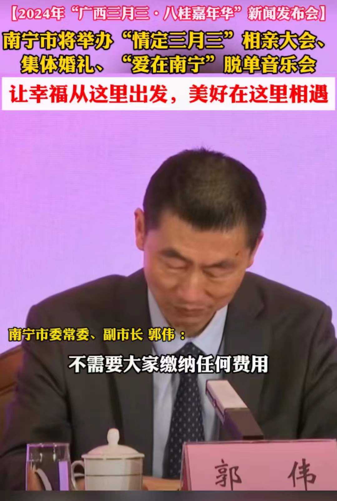 “广西三月三·八桂嘉年华”新闻发布会上,南宁市委常委、副市长郭伟介绍,今年“广西三月三”,南宁市将举办“情定三月三”相亲大会、集体婚礼、“爱在南宁”脱单音乐会,旨在为有意愿相识的青年男女提供交流平台,传递正确的人生观、价值观和婚恋幸福观。相亲大会和集体婚礼将免费举办,并设置各种互动相亲游戏,参与者将获得精美纪念品,从而增加活动的仪式感和幸福感。