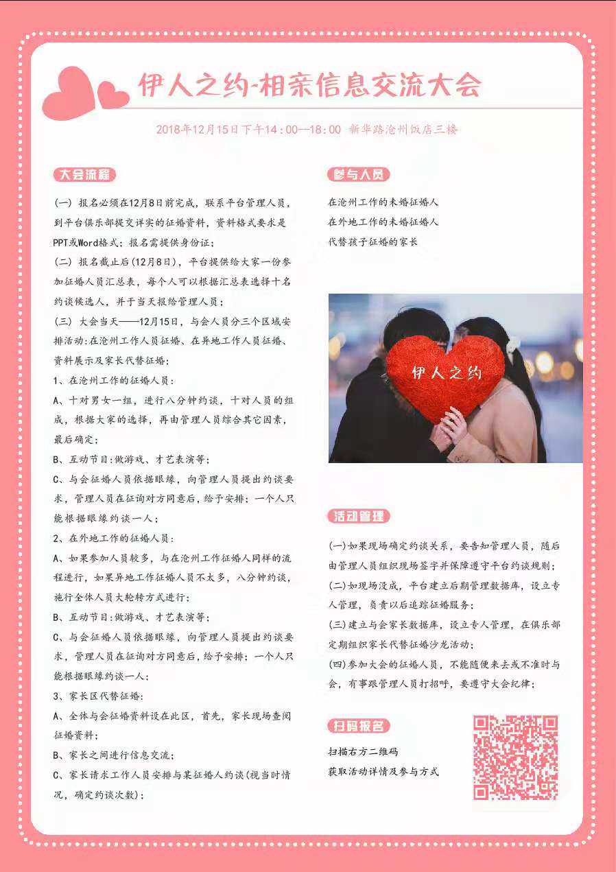 2018年已到岁尾,为了助力未婚的朋友征婚,伊人之约平台决定举办征婚信息交流大会,具体安排如下: