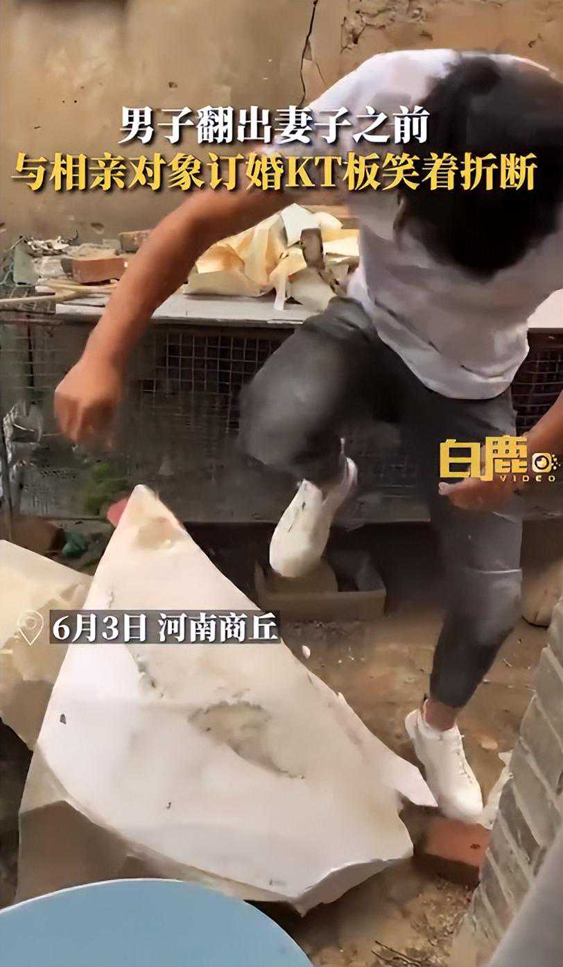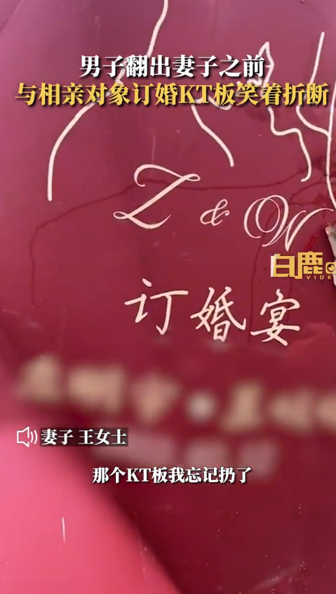 王女士称:“回我妈家那天收拾东西,那个KT板我忘记扔了,KT板上不是我现在的老公,他知道。因为我老公也是订过一次婚,他也退了。他看到KT板也不说话,就一直笑,拿着KT板疯狂踢,当时我觉得特别搞笑,他就跟我说,自己看到这个KT板又生气又好笑。”