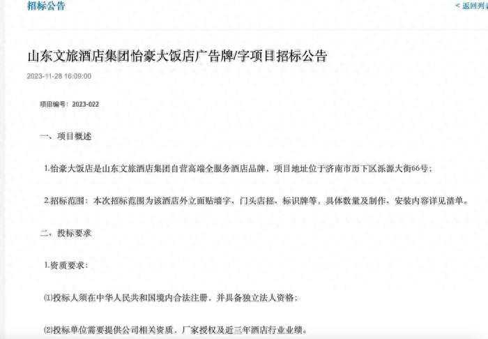 一份11月28日发布的《山东文旅酒店集团怡豪大饭店广告牌/字项目招标公告》显示,怡豪大饭店是山东文旅酒店集团自营高端全服务酒店品牌,项目地址位于济南市历下区泺源大街66号,招标范围包括该酒店外立面贴墙字、门头店招、标识牌等。