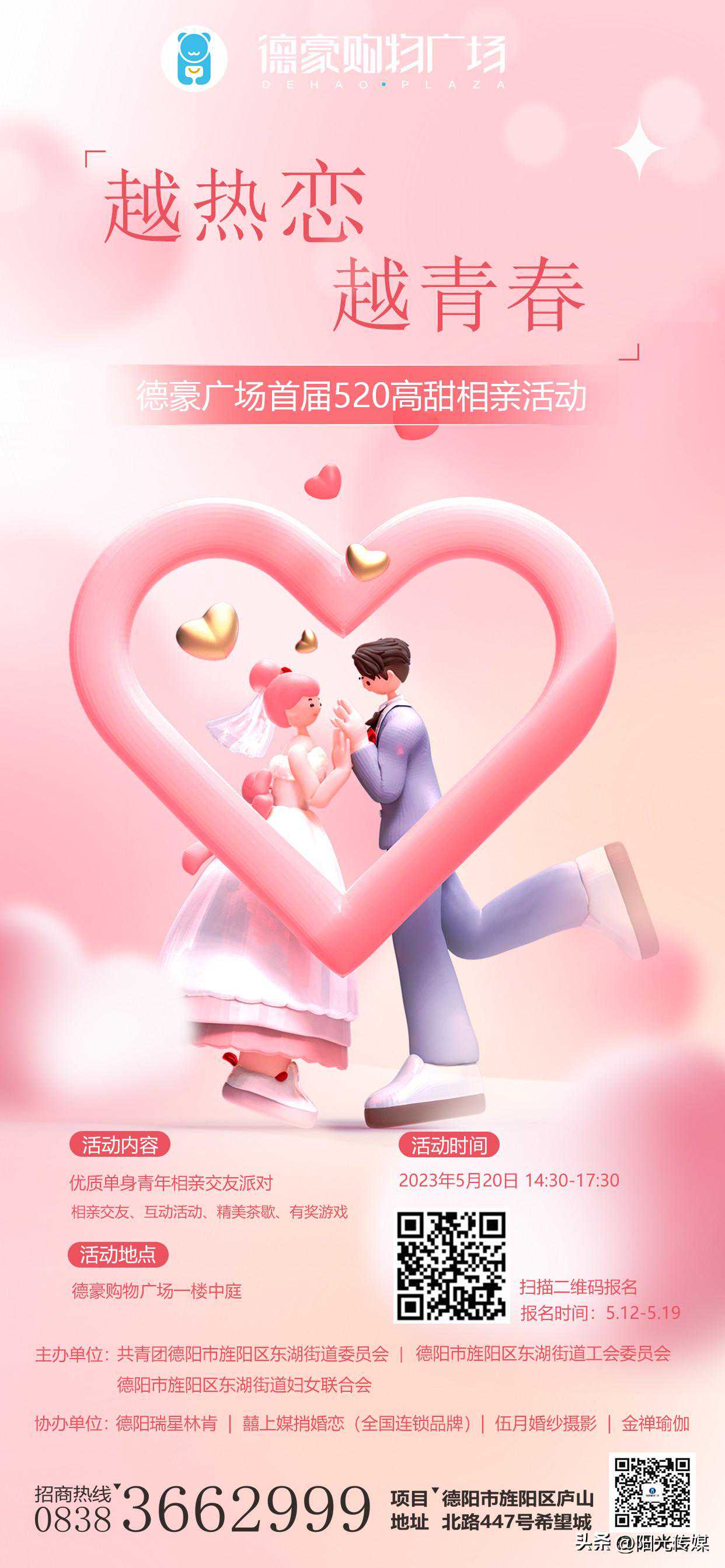 “520”即将来临之际,为服务青年现实需求,拓宽青年交友渠道,助推青年和人才友好型城市建设,德阳市旌阳区东湖街道共青团委员会、工会委员会、妇女联合会、德阳德豪广场购物中心联合举办“越热恋·越青春”青年婚恋交友活动。