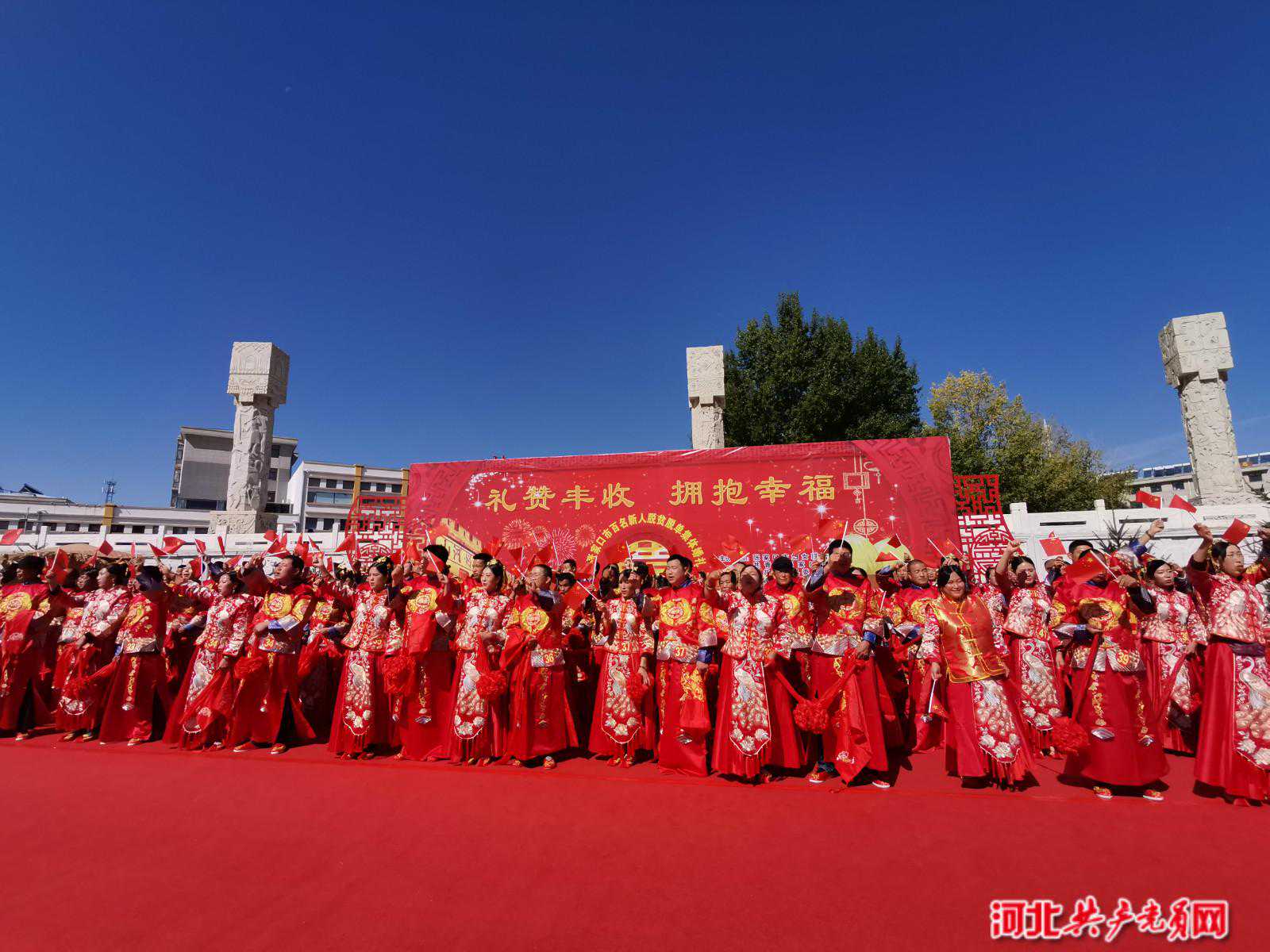 河北共产党员网省直讯(记者翟新建)9月23日上午10时,由张家口市妇女联合会、共青团张家口市委、中共沽源县委宣传部和沽源县扶贫开发办公室主办的2019年张家口市百名新人脱贫脱单大型集体婚礼在沽源县隆重举行,这一天也正是我国第二个“中国农民丰收节”,整场活动以“礼赞丰收、拥抱幸福”为主题,寓意百名新人携手一起收获脱贫攻坚的累累硕果,一起收获幸福美满的婚姻家庭。在活动现场,1000多名嘉宾及观众共同见证了百名新人的美好时刻。他们积极弘扬移风易俗、婚事新办、文明节俭、健康向上的中华民族优良传统,向新中国成立70周年献礼!农业农村部农影中心副主任欧阳海洪,河北省妇联宣传部副部长石慧敏、何颖玉,市委常委、宣传部部长张春生,市人民政府副市长燕旺林,以及市妇联、团市委、沽源县等领导出席活动。(标红的可能有变动)