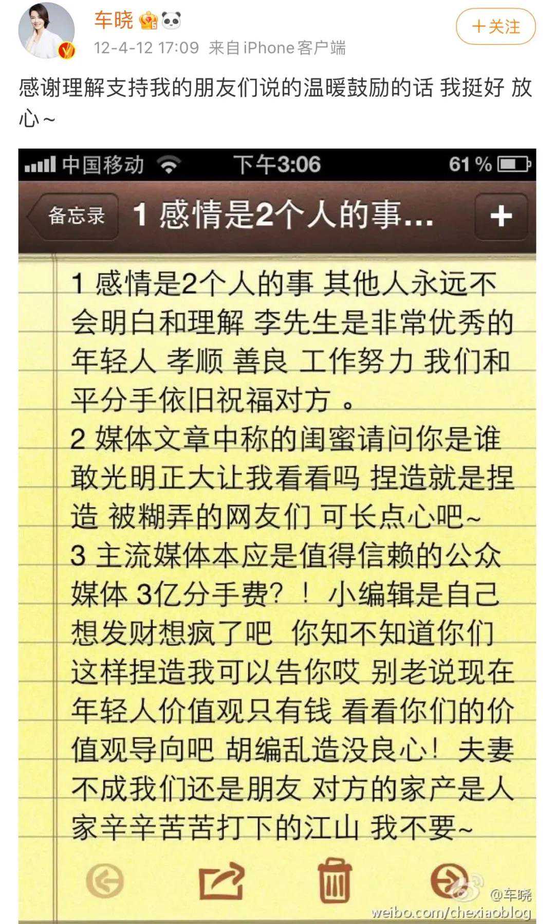 同时,坊间传言车晓拿了3亿分手费,但这个说法被车晓否认了。