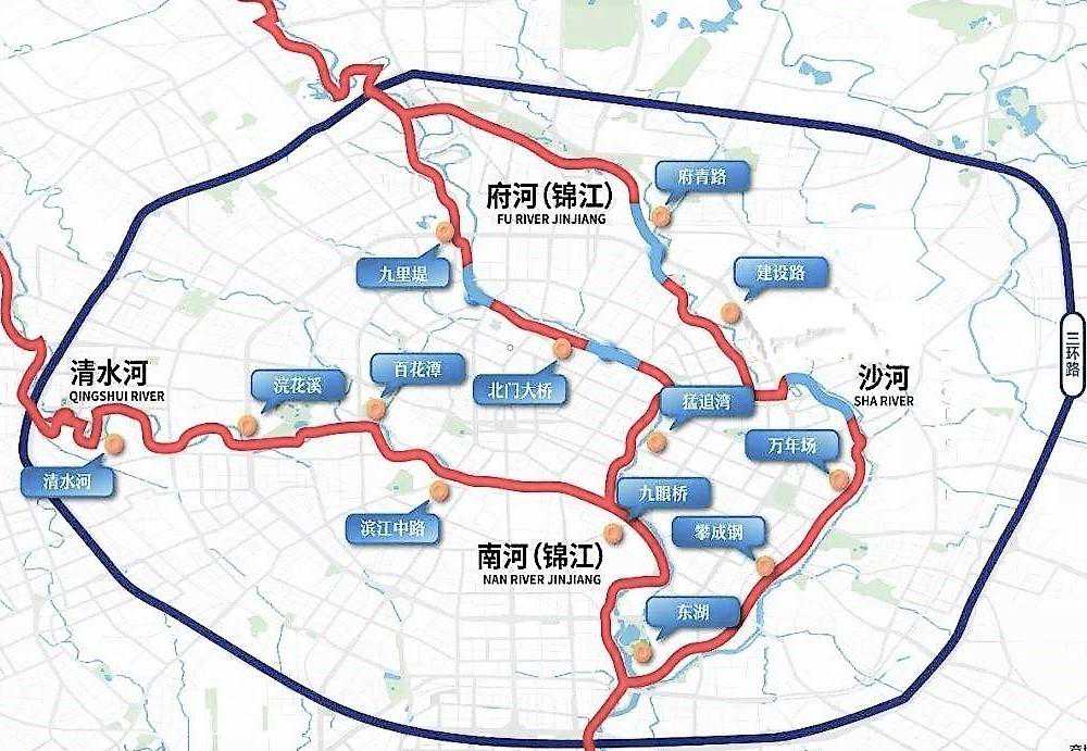 至于李冰所“穿二江”,在今一为南河,另一则为府河。它们在进入成都市区后分别绕城北、东而流,以及城西、南而流,并于合江亭(成都知名景点九眼桥即在附近)处汇合。再往南经乐山、宜宾入长江。