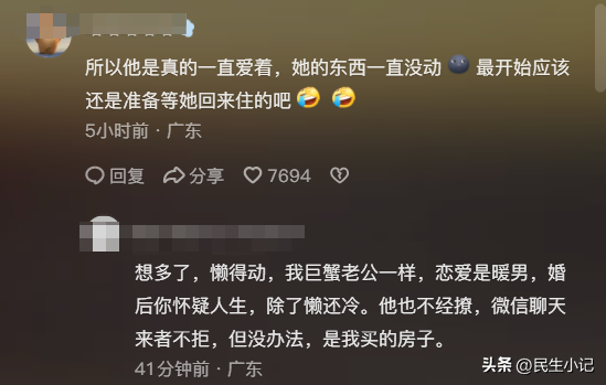想多了,懒得动,我巨蟹老公一样,恋爱是暖男,婚后你怀疑人生,除了懒还冷。他也不经撩,微信聊天来者不拒,但没办法,是我买的房子。