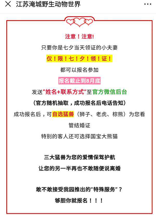 据淹城动物园官方微信文章,该动物园今年七夕推出了一项“爱情看管服务”:凡七夕当天领证的夫妻,可自选狮子、老虎、棕熊等猛兽帮他们看管结婚证,“特别的客人还可选择国宝大熊猫”。