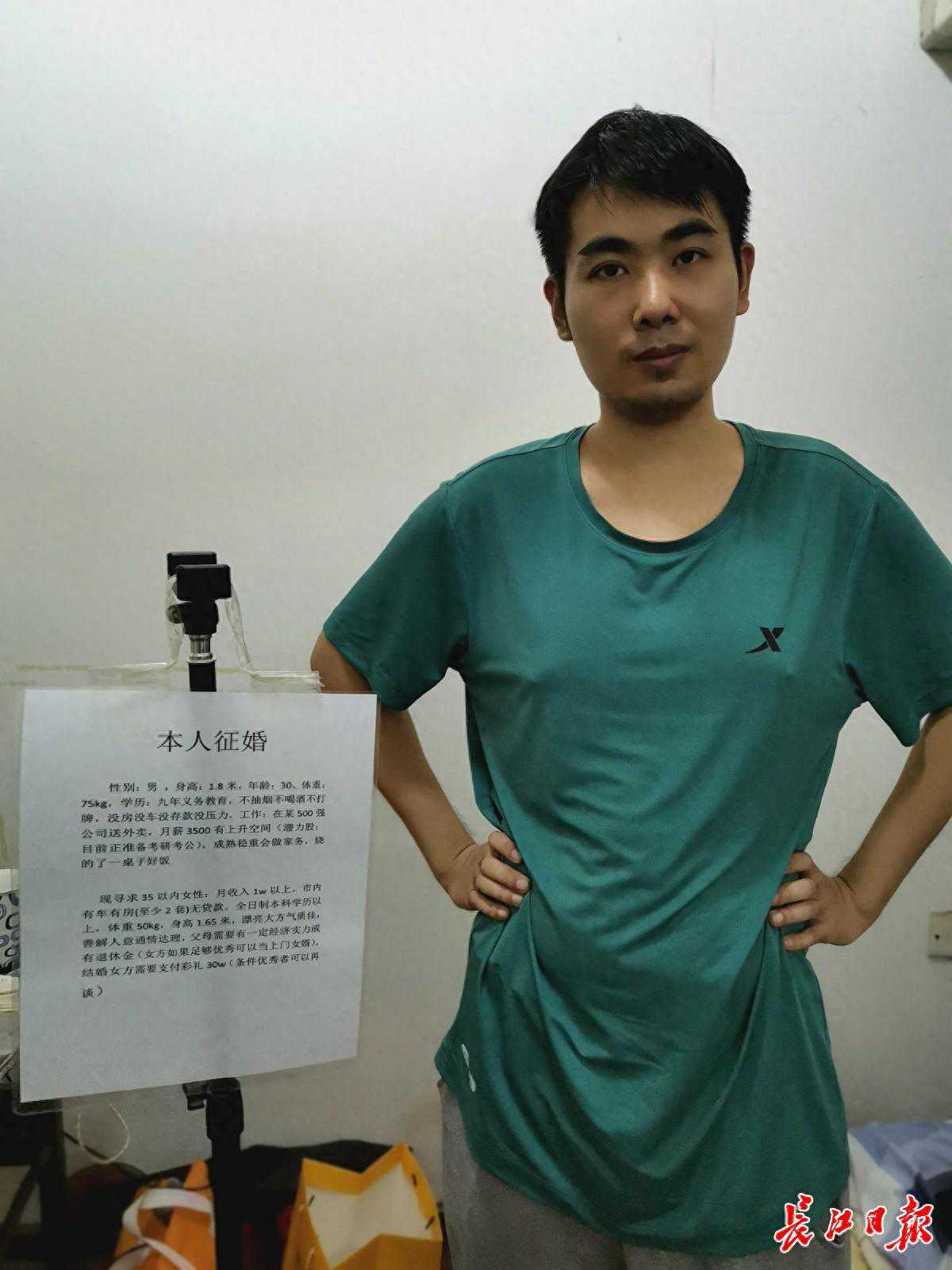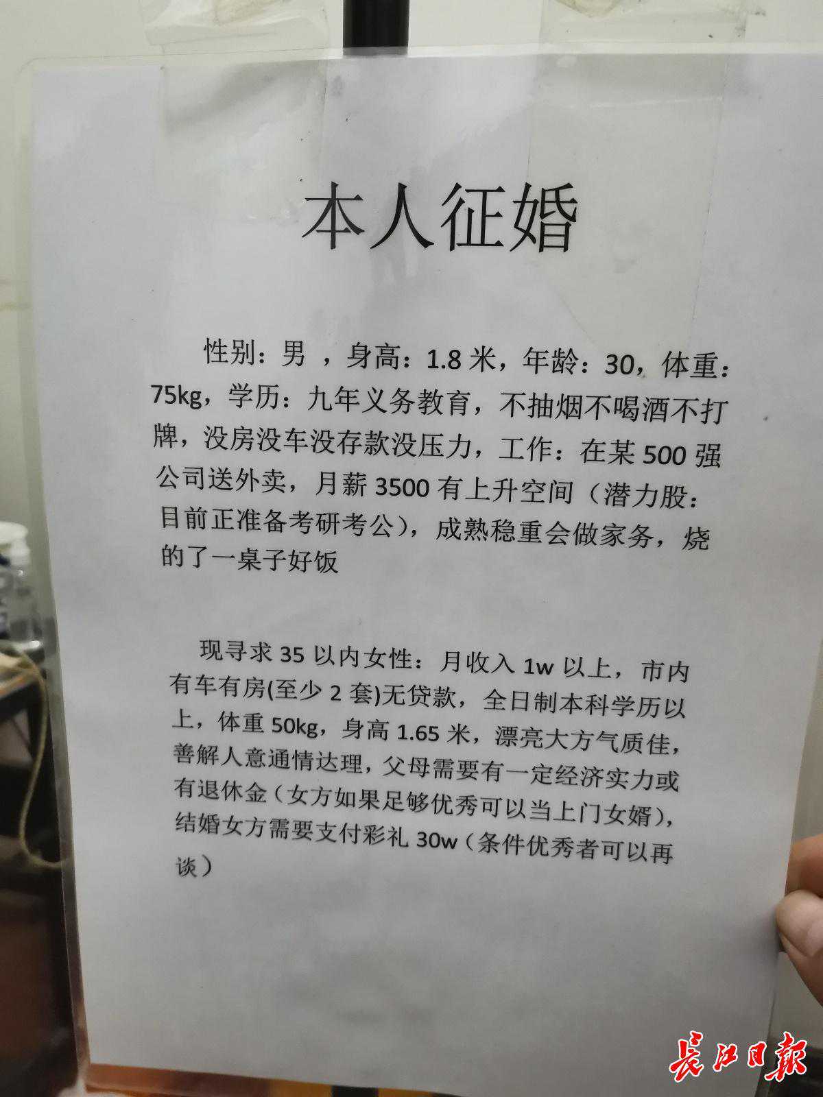 他对女方的要求则是35岁以内,月收入1万元以上,市内有车有房(至少2套)无贷款,全日制本科学历以上等。他特别注明,结婚女方需支付彩礼30万元。