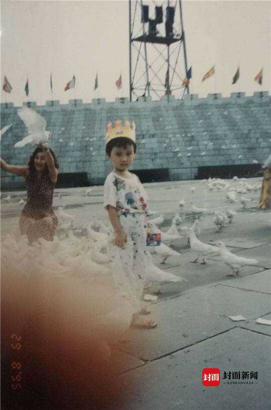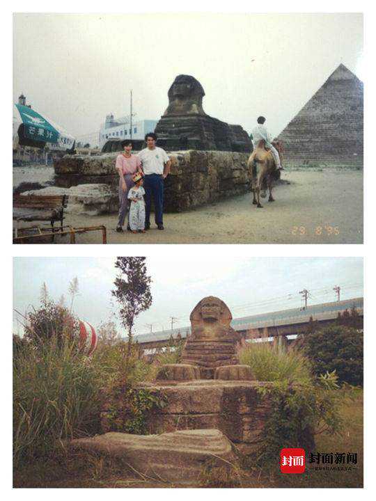 在成都一家媒体上班的重庆妹子曦曦家的老照片上,就有这个地方。那是1995年,世界乐园开放的第二年。父母带着4岁的她来这里玩。照片上能清晰地看到狮身人面像,在类似城墙面前的广场上,还有一群白鸽。