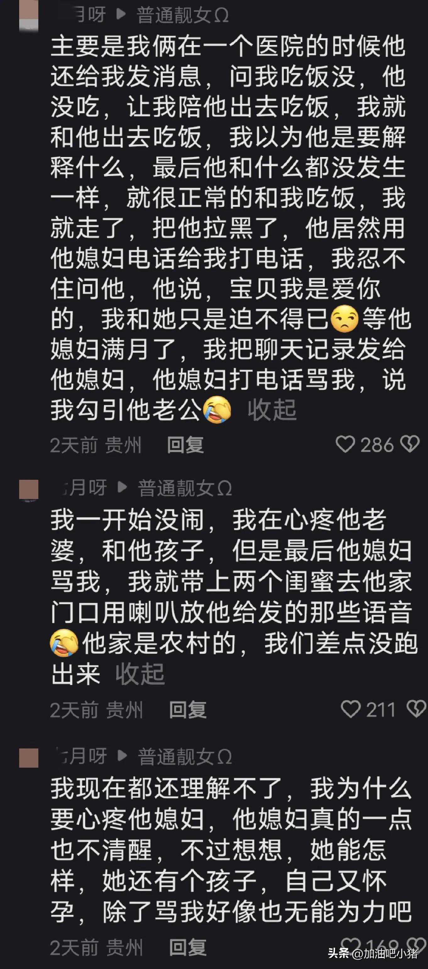处了多久?这藏的真好啊!现在应该是前男友了吧?妥妥时间管理大师!这话说的简直太扎心!简单一句话:你走的是心,他们走的是肾。没想到遇到熟人了!这么刺激的吗?真的比连续剧都复杂。他能那么淡定不是一般的人啊!网友发问:他说冲奶粉吧,你那时候想的是什么?心态是不是都崩了?他老婆知道以后有没有闹啊?你呢,有没有闹呀?
