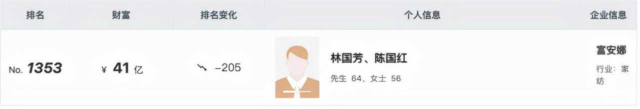2020发布的胡润百富榜显示,林国芳及陈国红身家合计达到41亿,排在1353名。