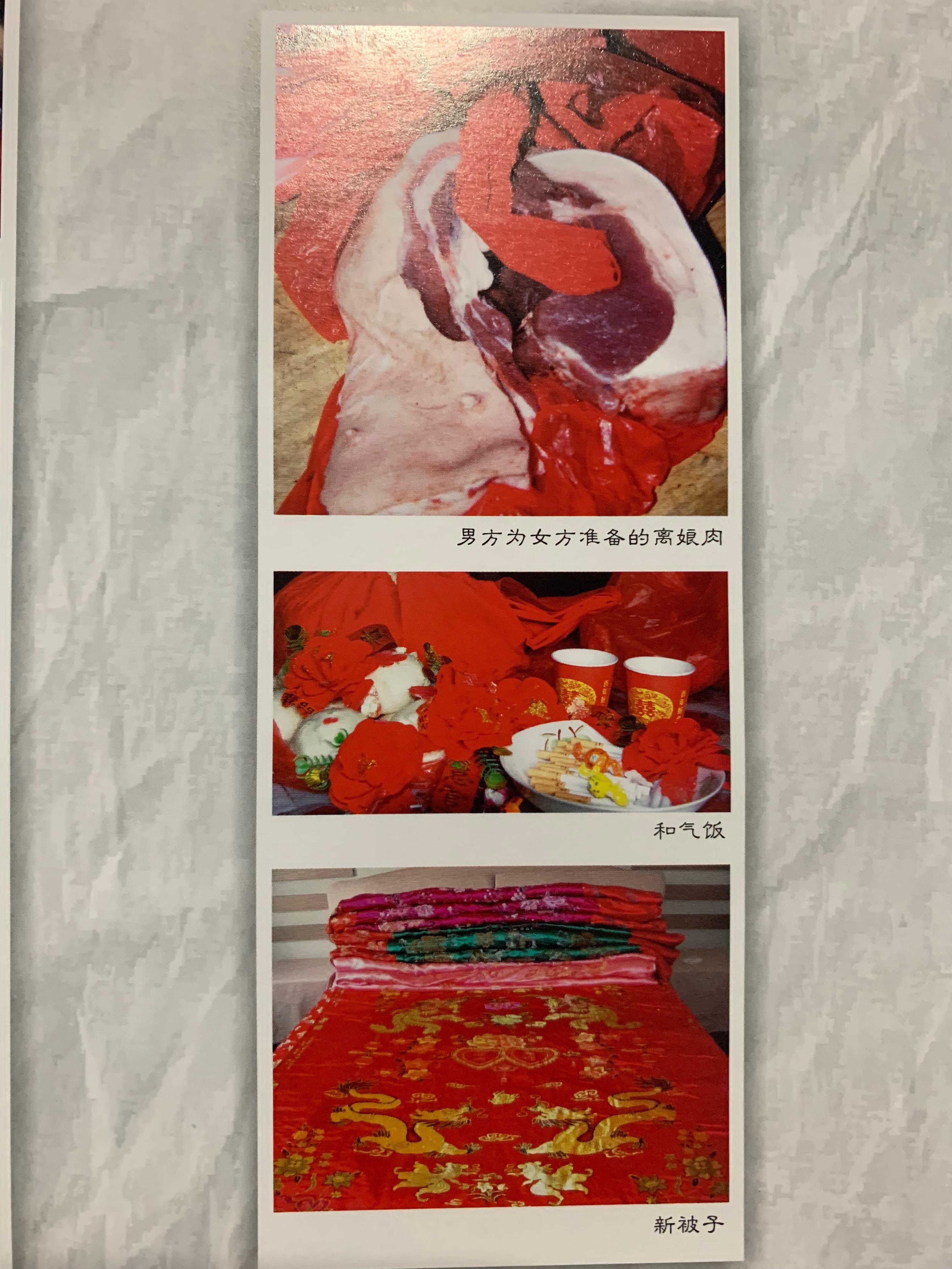 祁县男方要带柏叶和鮮花,红毛绳,这里的红毛绳鼎交与女方,在新娘起程时要在新的头上打结,结要打成活的。这里有个讲究,打的结一拉开表示原配夫妻可用,如果是再婚的话,就打成死结。在女方的家中备有红色包裹、脸金内有酒盅4只(要互相扣起来),一个里面是红糖,一个里面线在一块),大饮子ー个(里面包有セ个小饮子,意思是五男ニ女も子团是蜂客(意思是甜甜蜜案),还有双头越,双头辣椒,一双红子(要用红圆),用红纸包炭块一块,红土包土一包,红苹果4个・这是一个包里要放的,其他包放什么随便,只要是渉及到新娘用的东西就可以,在新娘启程时要在新娘穿的鞋墊下面別上七根针(叫明眼针)。在新娘娶到男方家的时候男方家的人给新娘要解掉打的结,一边解一边还要嘴里念叨着“结打淂好黒毛活到白毛了(意思是要长寿)”。