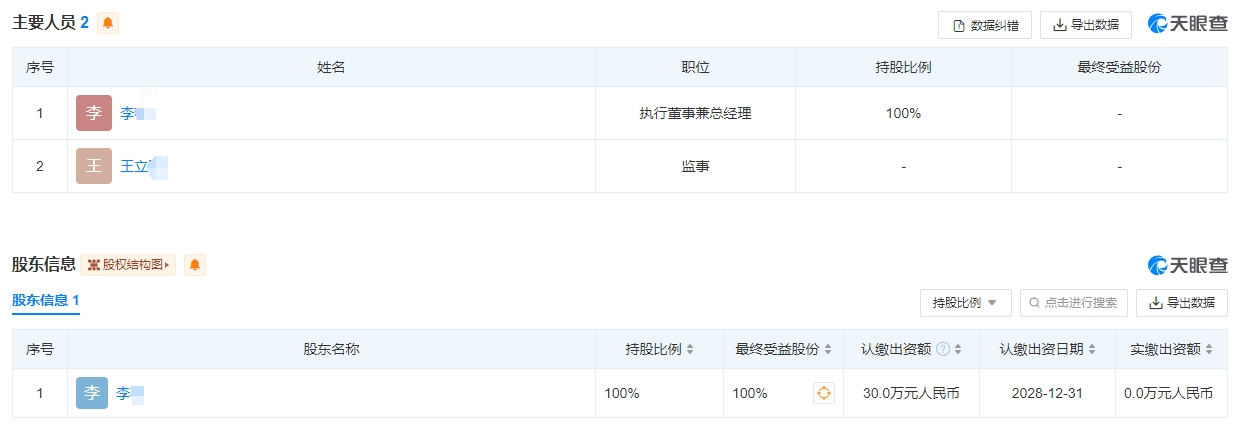 天眼查显示,该公司执行董事兼总经理为李某,监事是王立某。