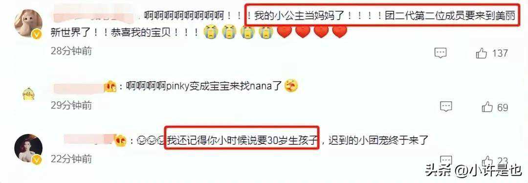 当得知任家萱怀孕,不少粉丝感动留言称“我还记得你的小时候说要30岁生孩子,如今迟到的小团宠终于来了”、“我的宝贝有了她的宝贝”。
