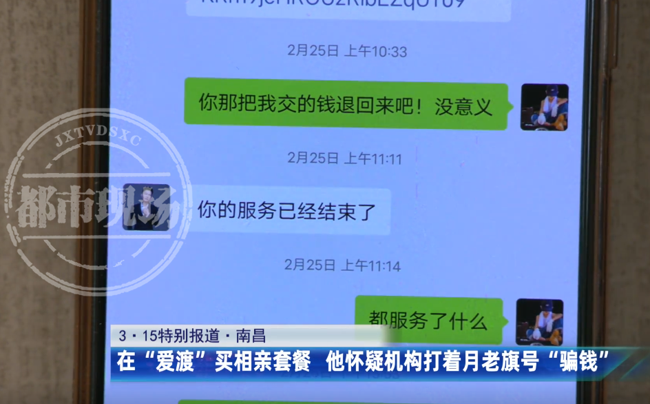 恋爱结婚讲究缘分,很多人都觉得应该顺其自然,然而在当下这个快节奏的生活时代,也有人为脱单问题感到焦虑。为了解决婚恋问题,一些人选择向高端婚恋机构寻求帮助,希望通过它们的“牵线”,找到另一半。然而,一些鱼龙混杂的婚介机构,却让不少人栽了跟头。消费者想找真爱,他们却把消费者当“韭菜”!今年的3·15前夕,江西都市频道24小时新闻热线0791—88316800就接到了多位消费者对一家名叫“爱渡”的婚恋机构的投诉。