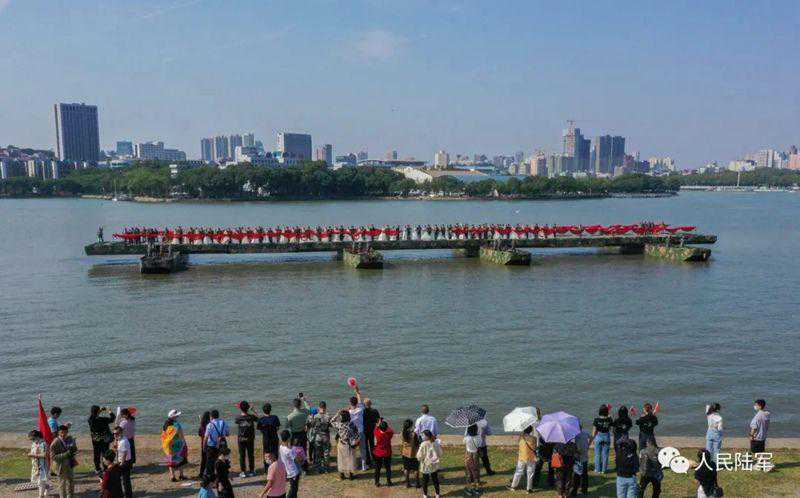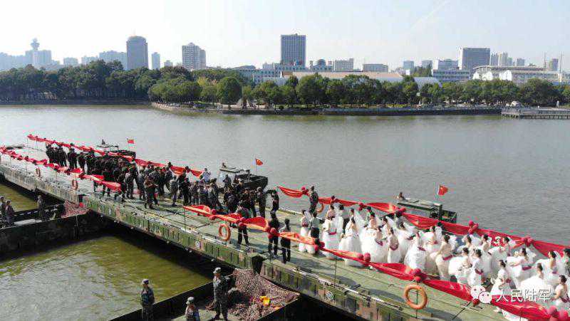 这一次“鹊桥相会”,是中部战区陆军某舟桥旅举办军营集体婚礼的一个活动环节,他们利用最新舟桥装备,将新人漕渡至湖中央连通门桥,架起代表新人相逢、相知、相爱的“军恋鹊桥”。