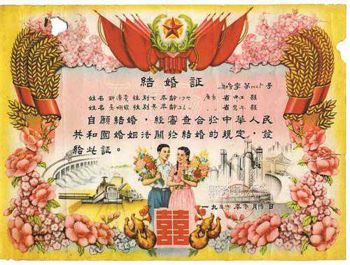 上世纪50年代的结婚证,出现麦穗等元素。