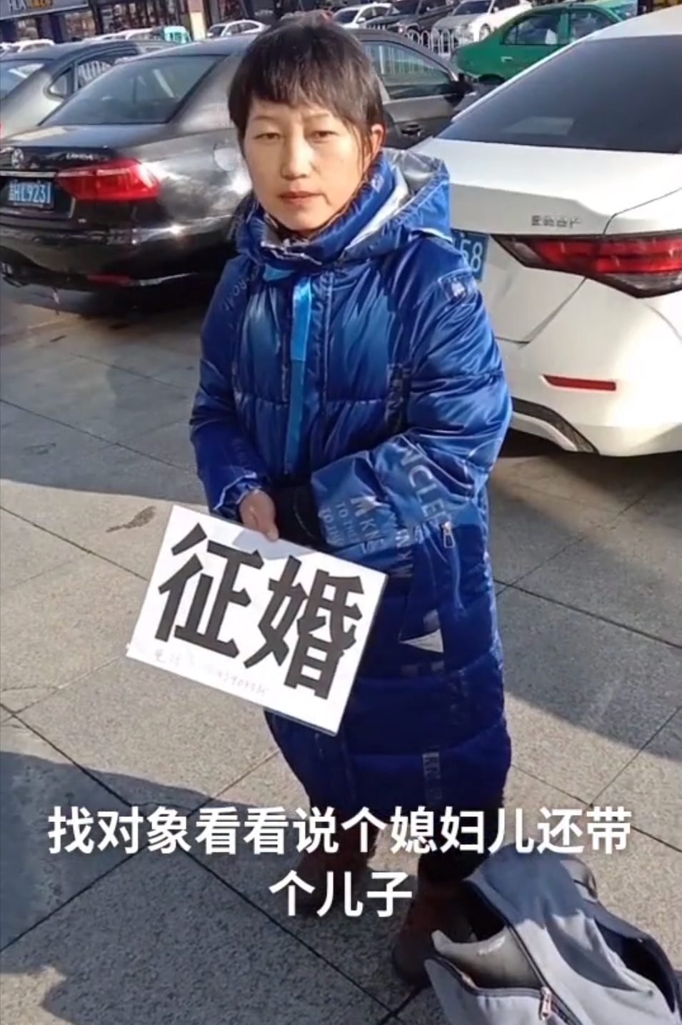 东北的气温已经降到了零下十几度,女子身穿蓝色羽绒服,双手长期暴露在空气中会被冻坏,她只能不停换手拿着征婚牌,一只手被冻得受不了就换另外一只手。