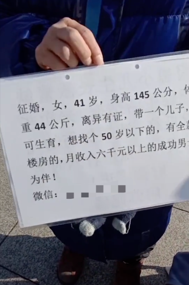女子配合大妈,将牌子翻了过来,牌子的背面写着她的个人信息和联系方式,还有对未来另一半的详细要求:女子今年41岁,身高145公分,体重44公斤,离异带一个儿子;对另一半的要求是:50周岁以下,全款买房,月薪6000以上。