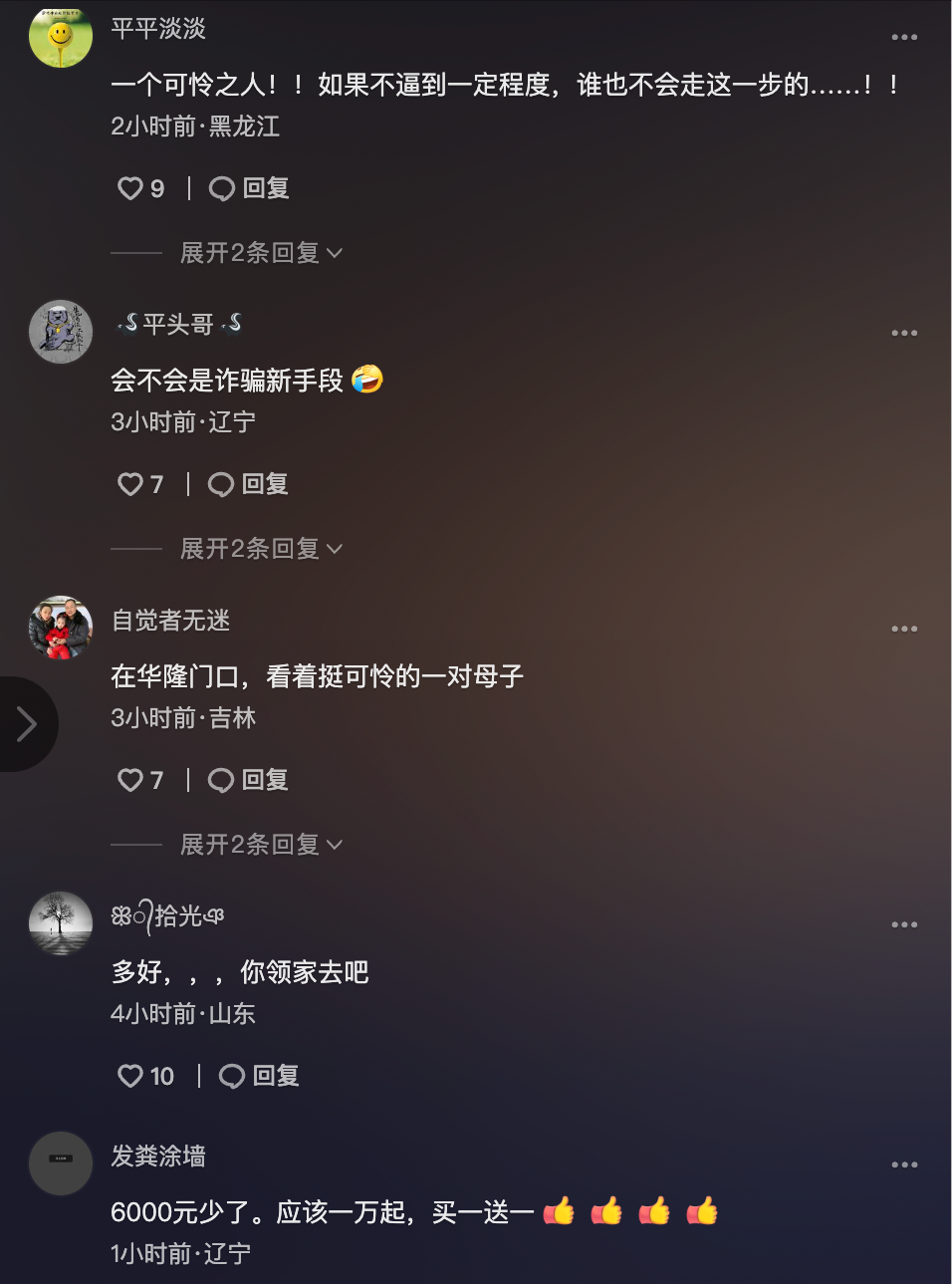 不少路人对这对母子的遭遇心生怜悯,但也无能为力,其中一位热心大妈走上前来询问情况,不知是出于好心还是嘲讽,说了这么一段话:“看看,说个媳妇儿还带着儿子,多好啊!”