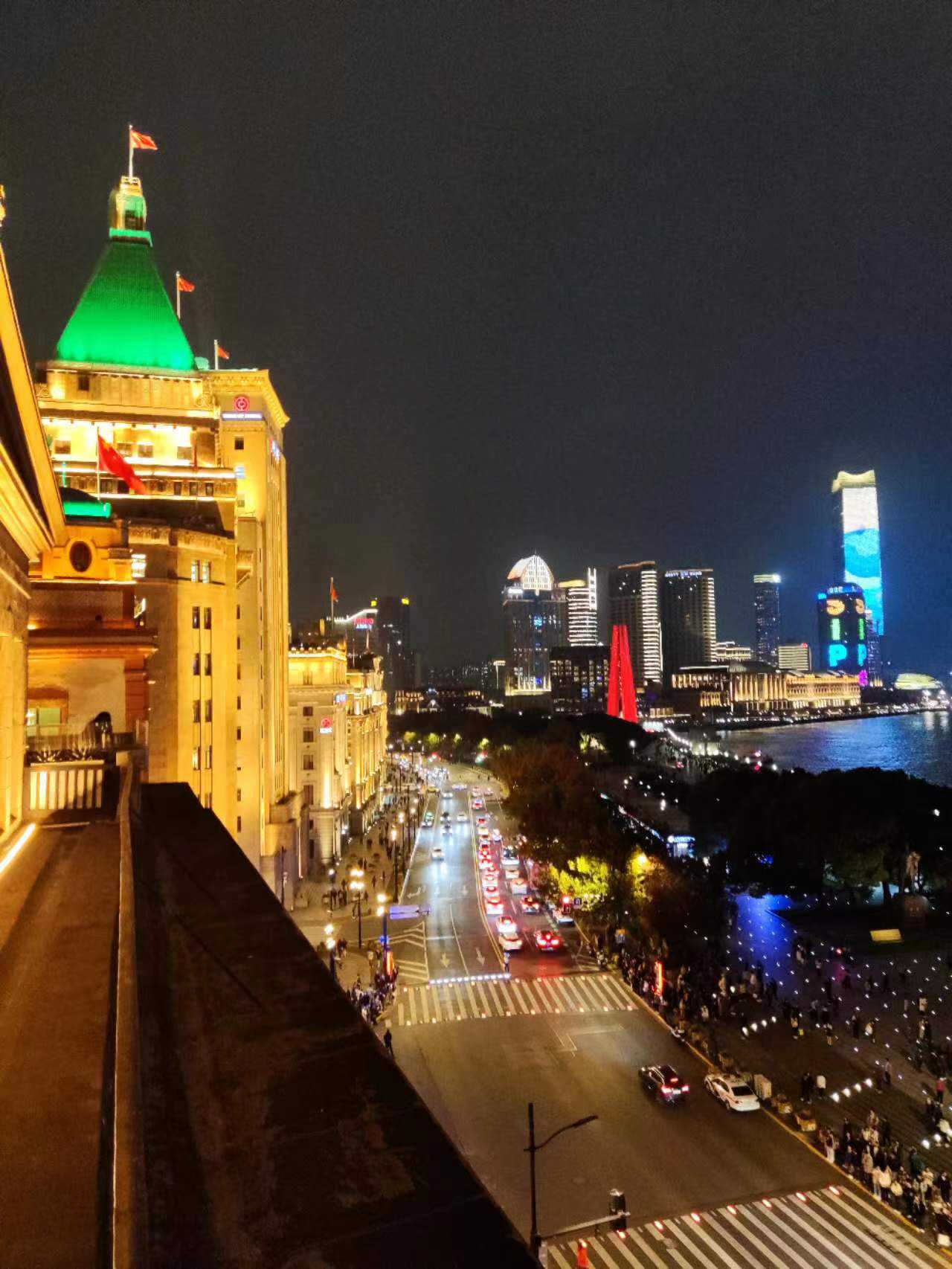 这个MrMrsBund餐厅有个好处就是外滩的夜景一览无遗,俺也跑去拍了几张照片,上海外滩的夜景一直都是网红打卡的地方,这回找到了一个好地方。时间到了九点半多了,据说是新郎新娘切蛋糕的时候了,我们这一些客人也应该到了告辞的时候。