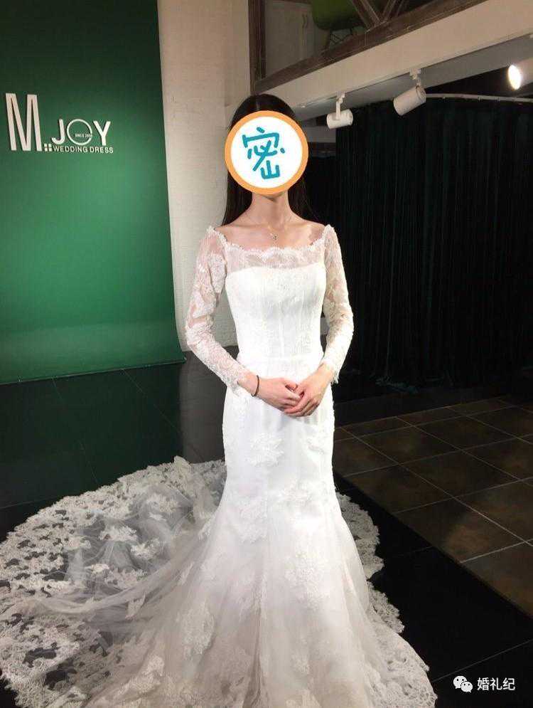 第二件是老板帮我选的,蕾丝包袖鱼尾款。由于比较瘦,之前试的时候一直不敢尝试鱼尾的款式,怕会显得更瘦。这件穿起来却完全不会有瘦的问题,显得非常优雅、大气。上身稍微修改合身后应该效果会更好。