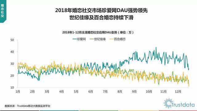 在《互联网周刊》发布的2017年度婚恋交友App中,世纪佳缘、百合网和珍爱网分列前三,然而Trustdata移动报告数据表明,2018年1月-12月期间,世纪佳缘及百合婚恋的DAU却是一路走低的态势。即使春节期间,二者排名,也是十名开外。对婚恋APP来说,日活和月活是重要评判指标,也是行业营收的重要参考标准。