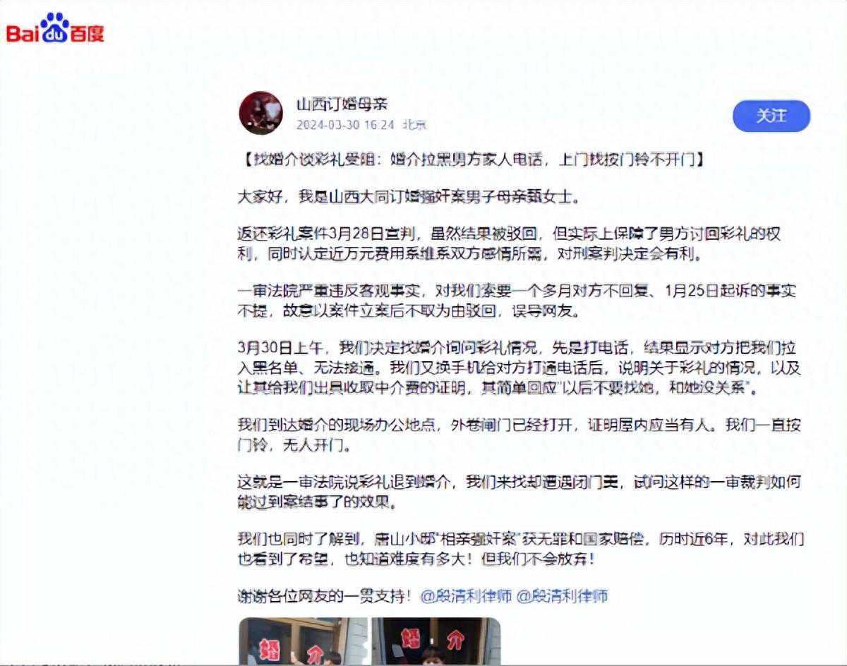 3月30日,男方母亲甄女士在网络平台发文称,他们于30日上午前往婚介公司询问彩礼情况却吃了闭门羹。