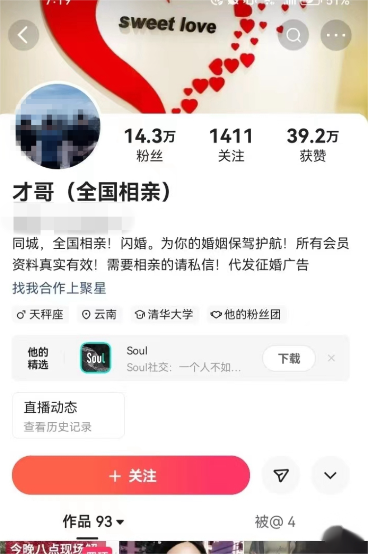 该主播在接受某平台采访时还声称自己是正规婚介,有需求可以到他们线下的婚介所相亲,“交完彩礼,另付两万元介绍费就可以把人领走,先结婚后恋爱。”
