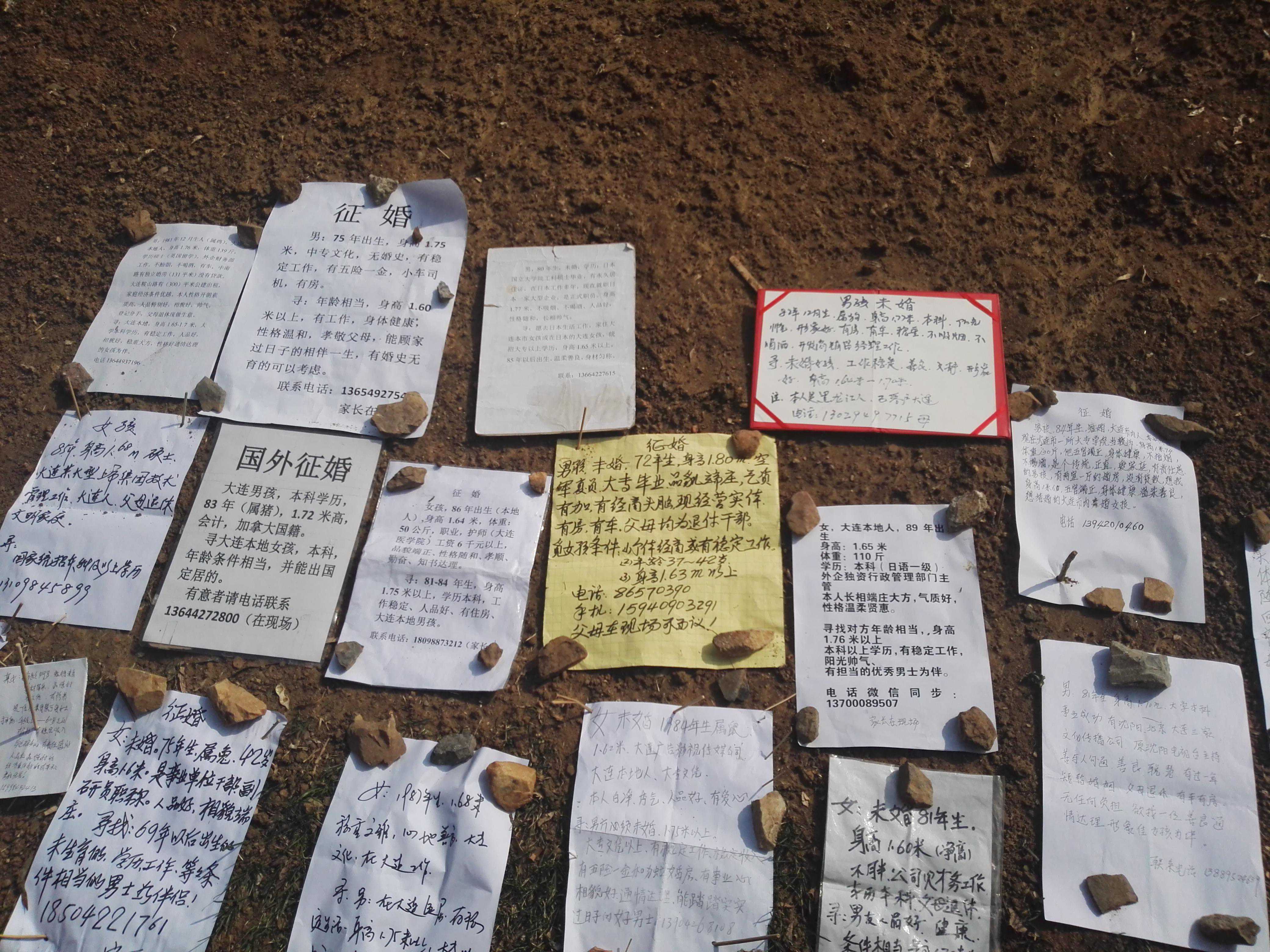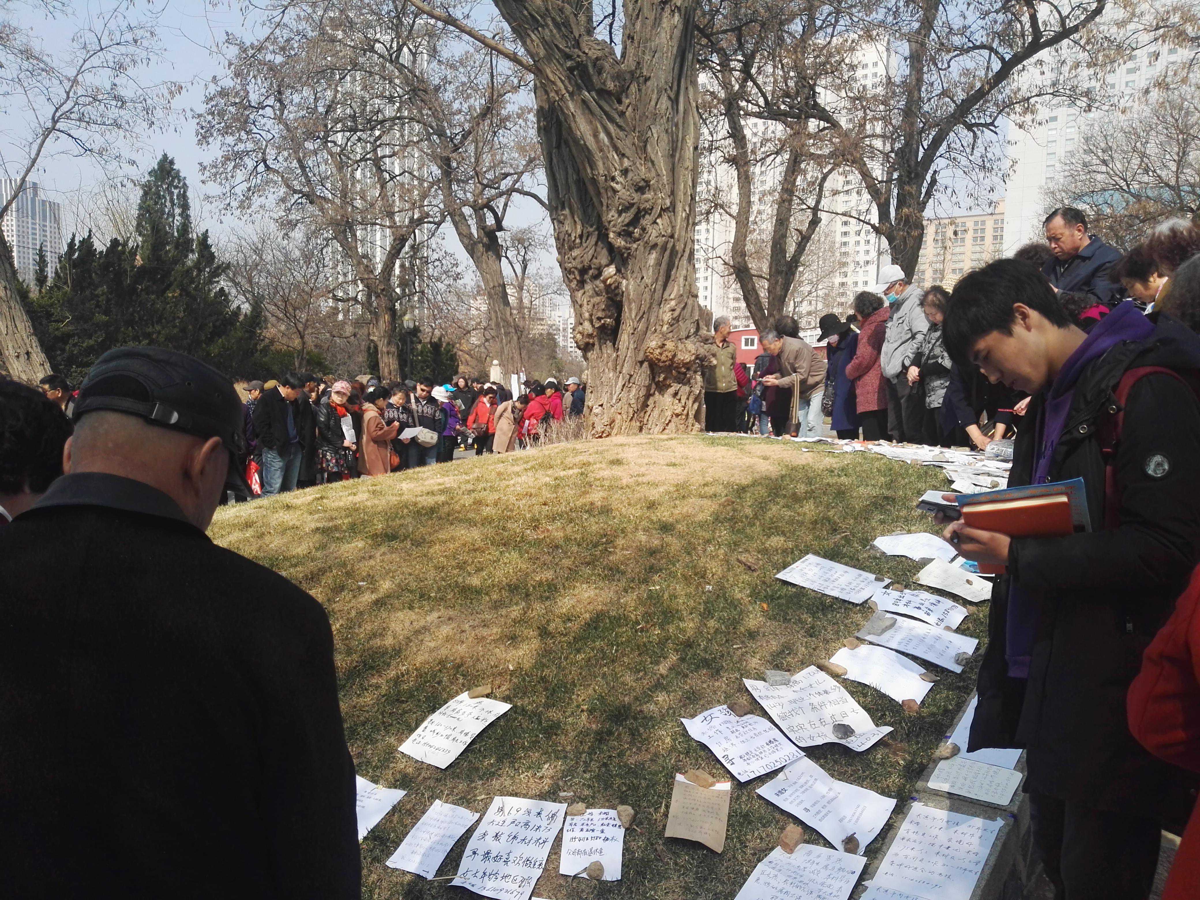 前几年一开始是零星的父母,自发的聚集在公园的一偶,拿着儿女的征婚广告,利用周末游园人多的优势,为儿女征婚。