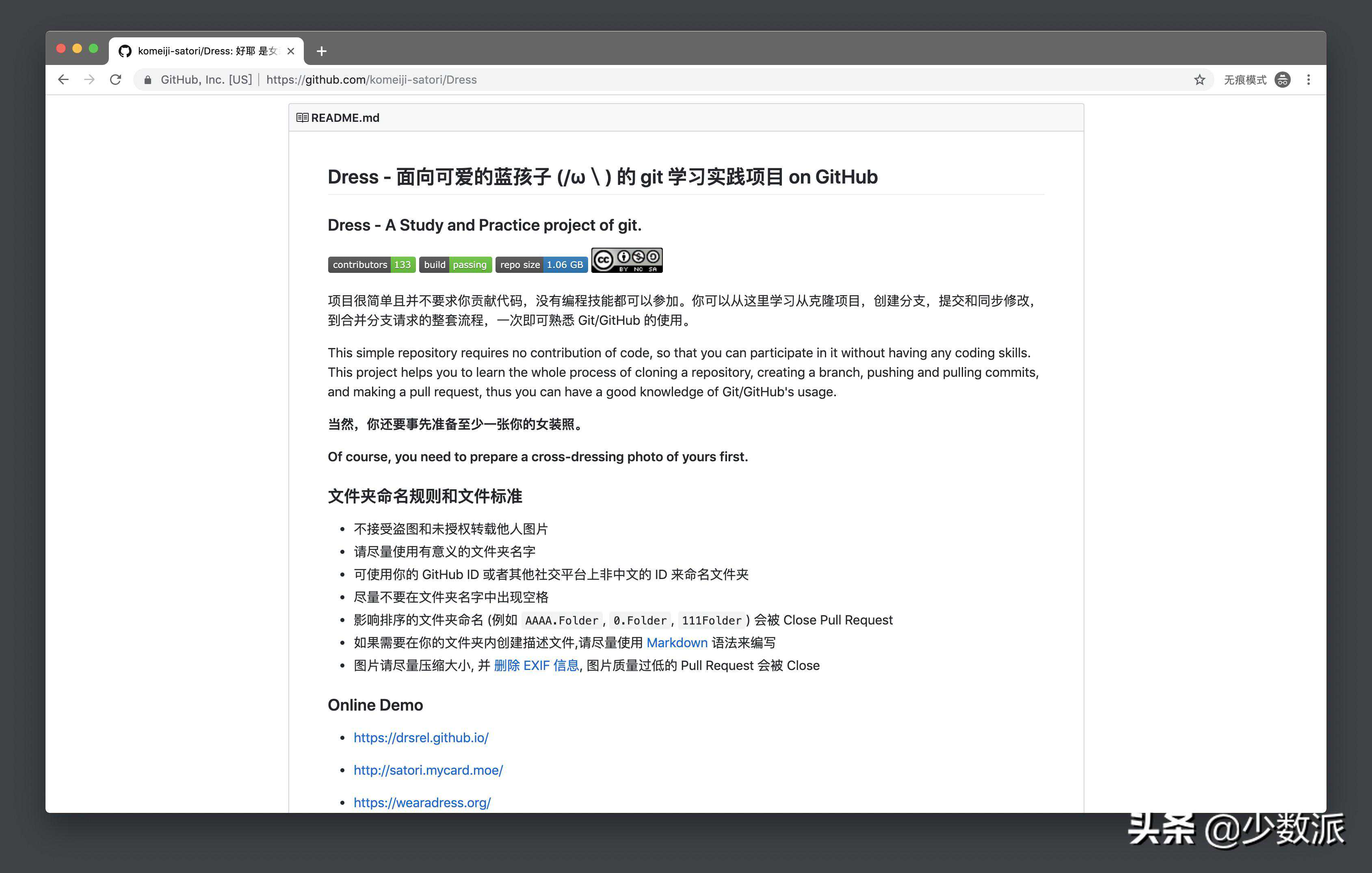 编程第一步,女装身上穿众所周知,女装是对程序员之祖埃达·洛夫莱斯的祭祀,可以有效提升编程效率、降低bug出现几率。如果你初入编程大门,不妨在Dress这一项目中提交一张女装照片,借此练习创建分支、提交和同步修改等Git基本操作,一举多得。