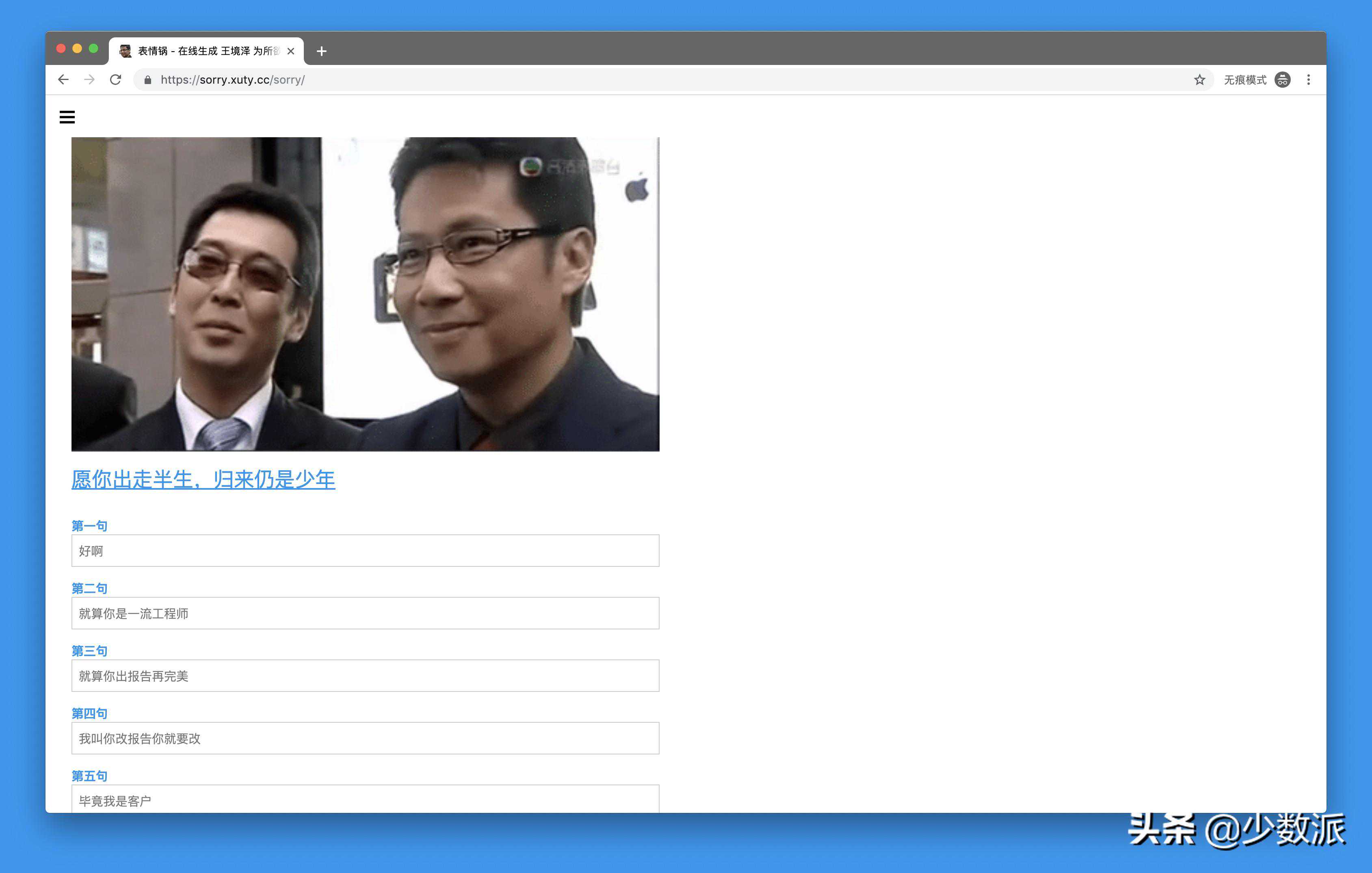 去年初,一张「抱歉,有钱真的能为所欲为」的GIF及其改图火遍了整个中文互联网,究其源头,就是本节要介绍的sorry项目了。它不仅能制作sorry动图,还演化出了真香、谁赞成谁反对、吔屎啦梁非凡等诸多变体,助你从此称霸斗图界。