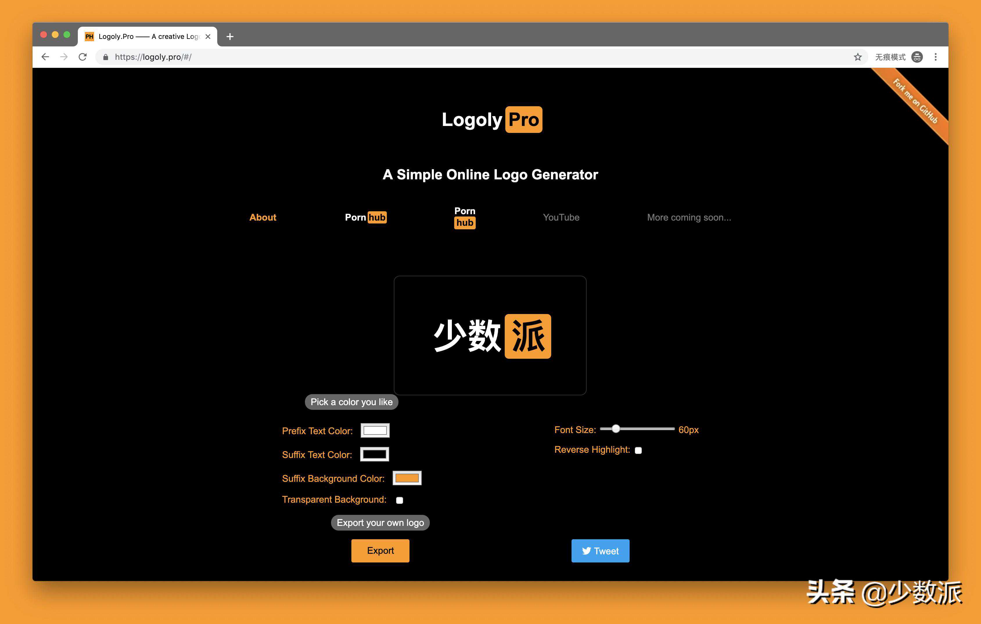 Pornhub是全球最知名的在线学习网站之一,聚合了大量考研资料、习题详解等资源。Logoly则是一款在线Pornhub风格Logo生成工具,你可以自由编辑Logo文字,并调整字体颜色、大小等,设计属于你的个性头像。