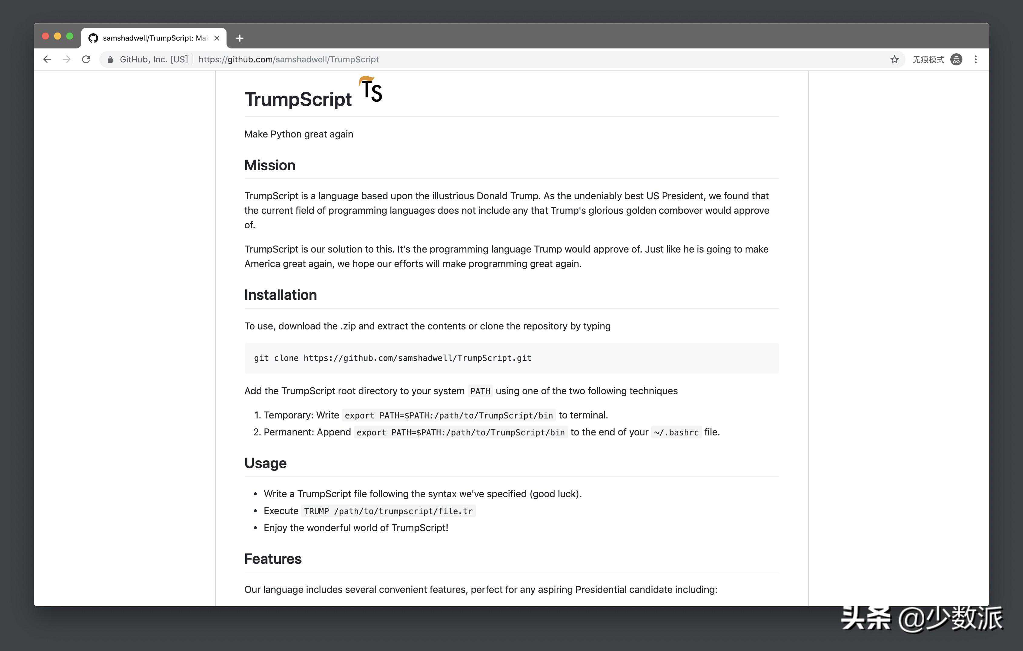 作为有史以来最特立独行的美国总统,川建国同志的一言一行都受到全球瞩目。为了向他致敬,TrumpScript这款Python脚本诞生了。它的语法规则符合特朗普的各种推特习惯:不区分大小写、所有程序必须以Americaisgreat结尾、拒绝在中国和墨西哥计算机上运行……如果你是川粉,千万不要错过。