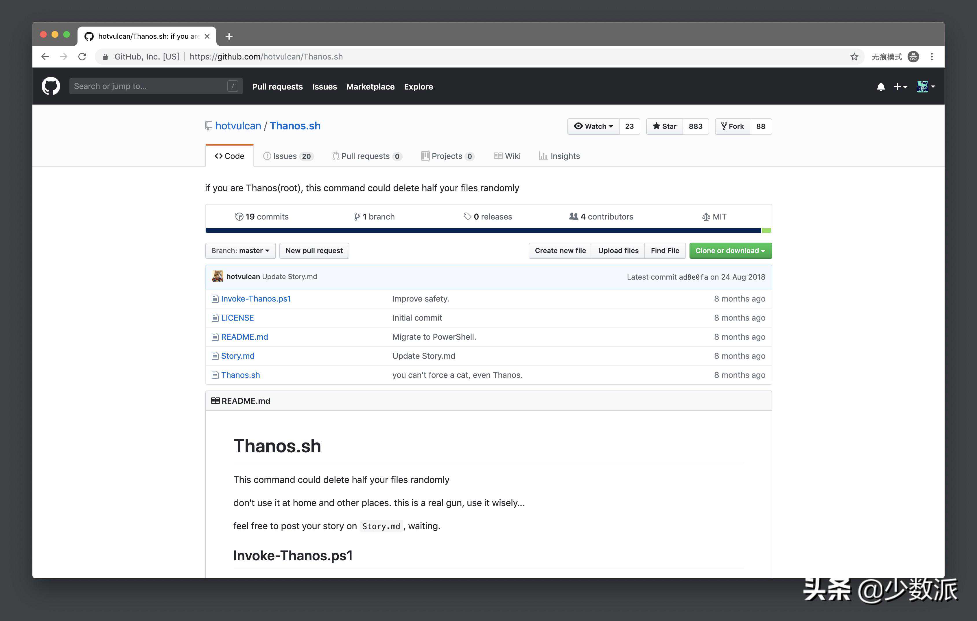 如果你觉得电脑空间不够用了,不妨试试(灭霸脚本),只需一行命令,它就会随机删除硬盘上的一半文件,且无法恢复。如果你是乐于助人的灭霸本霸,建议在好友的电脑上使用,记得提前买好人身意外险哦。