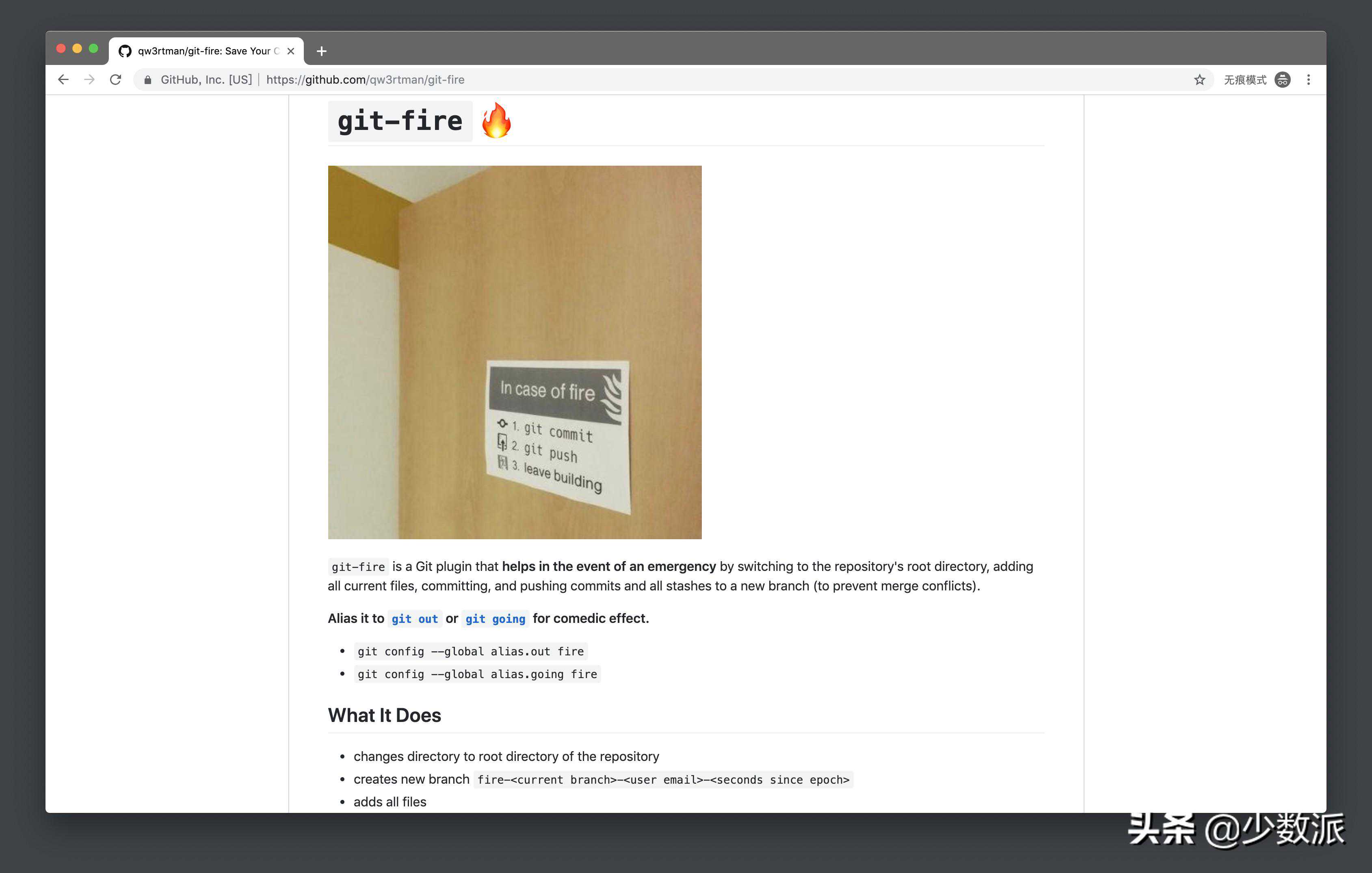 突发火灾怎么办,赶紧跳窗逃命?不,一位合格的程序员应该首先想到保存工作、提交更改。但在紧急情况下,这些操作很可能导致merge冲突等诸多问题,这时,就要请出git-fire脚本了。它会在提交代码时自动创建新分支并注释,防止你的工作丢失,拿到每月全勤奖。