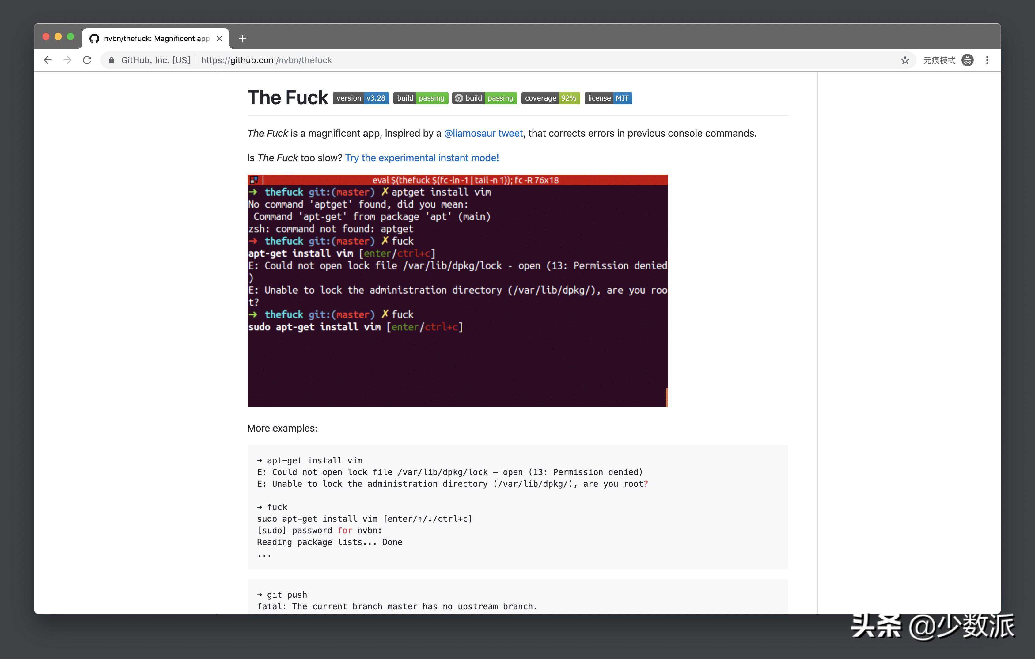 在终端愉快地敲着命令行,却不小心按错了键,看到commandnotfound的错误提示,一句whatthefuck不禁喷涌而出。受此启发,一款名为thefuck的工具诞生了,当敲错命令时,只需输入fuck并回车,它就会帮助你自动更正,省下重新输入的烦恼。