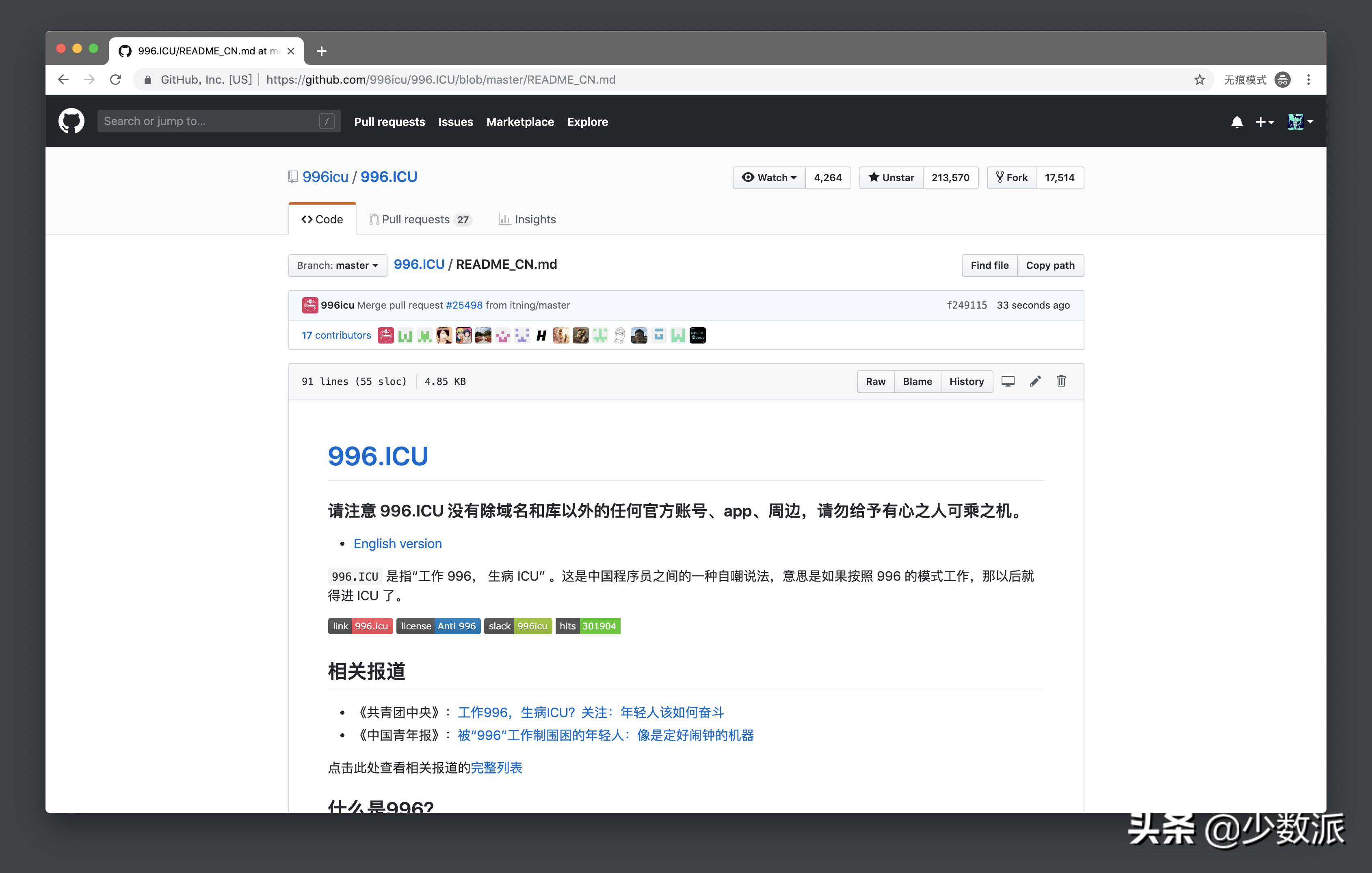 最近GitHub上最热门的项目莫过于996.ICU了,它在短短数天内就斩获了21W+star,成为了GitHub有史以来赞数第二高的项目,影响也从程序员圈内波及到了大众范围。