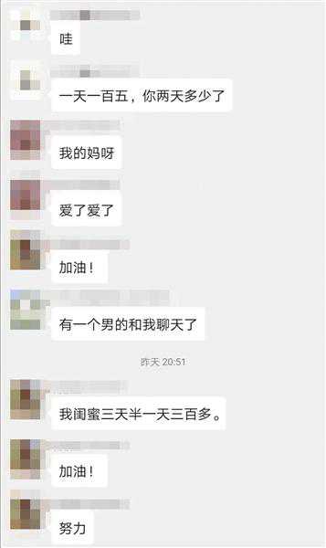 随后,记者被女子拉近一个“聊天赚米”群。在群里,有新入职的女孩说,她今天都和100多个人打招呼,只有3个人理她,有人安慰她,万事开头难,慢慢就多了。
