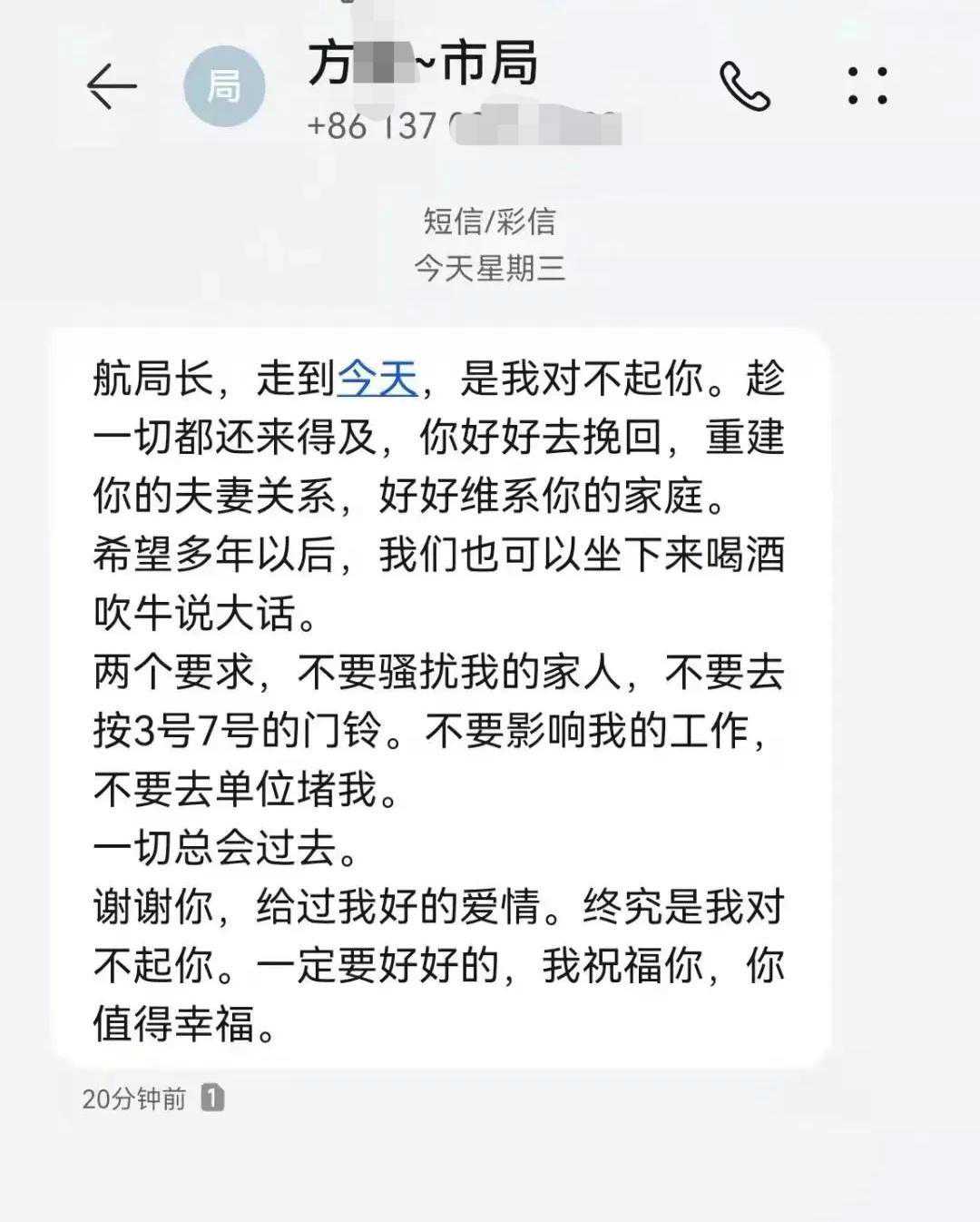 在刘女士曝光的一条方某给其前夫的短信中,小三方某表示是自己对不起史局长并要求史局长不要去骚扰自己的家人也不要到单位去堵自己。对此有网友分析表示:从当事人曝光的细节可以看出涉事局长是被小三给踹了,然后史局长天天去骚扰小三,随后小三无奈向原配发难并希望原配管好自己的老公,最终大家鱼死网破种出了一个大瓜。
