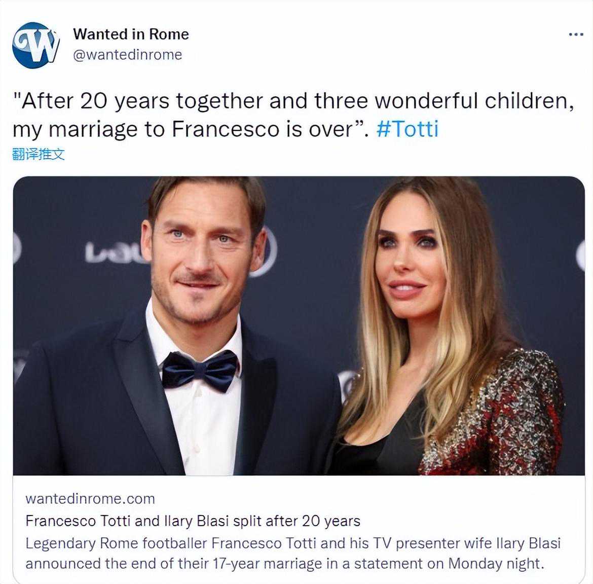 昨日,45岁狼王托蒂宣布跟结婚17年的妻子布拉茜正式离婚。随后,意大利八卦杂志《Chi》揭露两人离婚的原因,不是任何一方婚内出轨,而是双方都有约会对象。