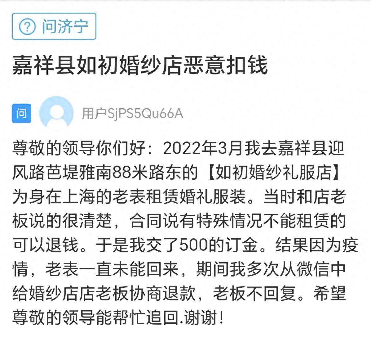 齐鲁网·闪电新闻4月4济宁的一位网友在《问政山东》网络问政平台留言:2022年3月,自己在嘉祥县一婚纱店打算租赁婚纱。老板表示,如果有特殊情况订金可退,于是交了500元订金,并且签了合同。然而,截至目前,由于特殊原因并未实际租用婚纱,但店家却拒绝退还订金。希望相关部门能够帮助解决退款问题。