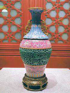 如今,各式各样的“皇家礼物”被摆上了一个L形的展台,颇有点“撞衫不可怕,谁丑谁尴尬”的架势。玉堂春瓶组,从乾隆到宣统,7位皇帝,7个青花缠枝莲纹玉堂春瓶并立。肉眼可辨的,乾隆时期的画工最好,之后每况愈下。吕成龙说:“到了宣统,蓝色中都带了紫红,因为当时用了‘洋蓝’的化工料来画,而不是天然的钴土矿,烧造出来颜色就不对了。事实上,御窑瓷器的烧造在道光以后越发衰败,不仅造型越来越不优雅,纹饰也缺乏精细灵动,就像印出来的一样。”